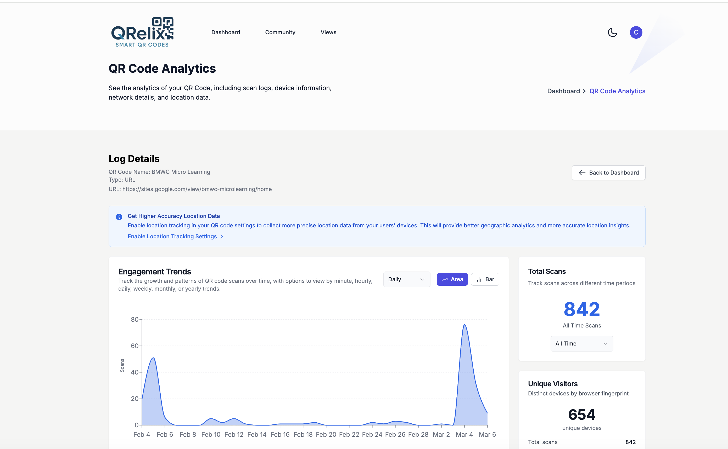 QRelix provides real-time QR code analytics and scan tracking for every dynamic QR code you create. Monitor total scans, unique visitors, scan location by city and country, device type, operating system, and time of access — all from a live analytics dashboard. Measure QR code campaign performanc...