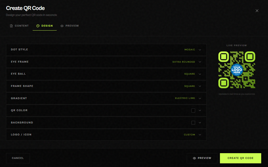 With QRfy, you can generate custom QR codes with your favourite logo, frame and colours. With your QR Code Generator, they'll be ready in just 5 minutes. You can create all kinds of QR codes, from a QR for your web page, a QR for your professional vCard or upload a PDF or Video document. You can create as many QR codes as you need, and forget about having to print a QR code again when you change the content because our QR codes are dynamic. What are you waiting for to try it?