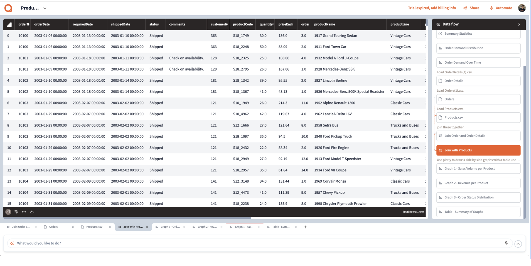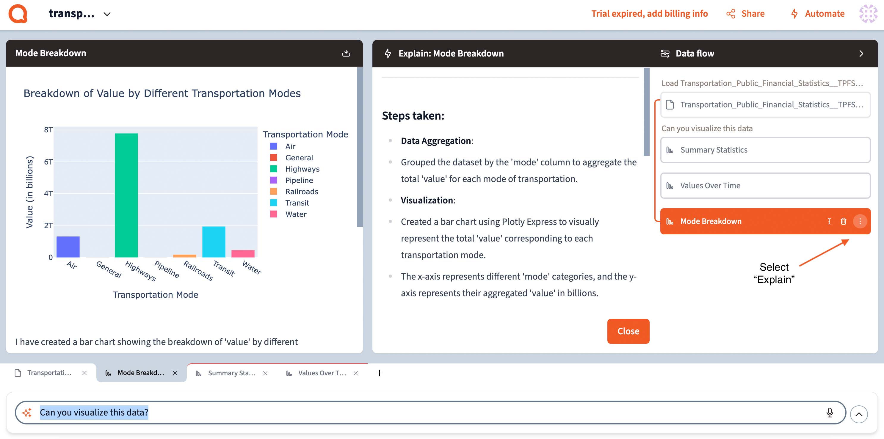 It has a very easy to follow step by step set up which guides you to use the tool. The UI is simple and very easy to understand while it stays fast and scrispy even after adding big rows csv. It also able to interprete my prompt to a logical algorithm step by step and youre able to see these steps in real time as they are executed. It can both transformt the data, and plot charts with the data. Review collected by and hosted on G2.com.