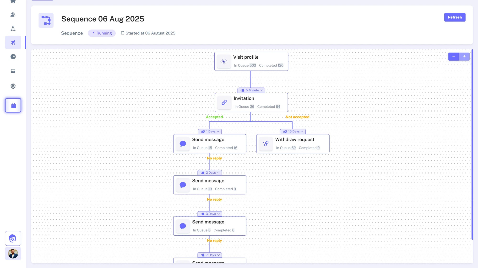 By leveraging this tool, you can create a sequence of pre-scheduled messages that are automatically sent based on specific triggers or time intervals. This allows you to nurture leads effectively without manual intervention. The feature supports both LinkedIn messages and emails, enabling a multi-channel approach to engagement.