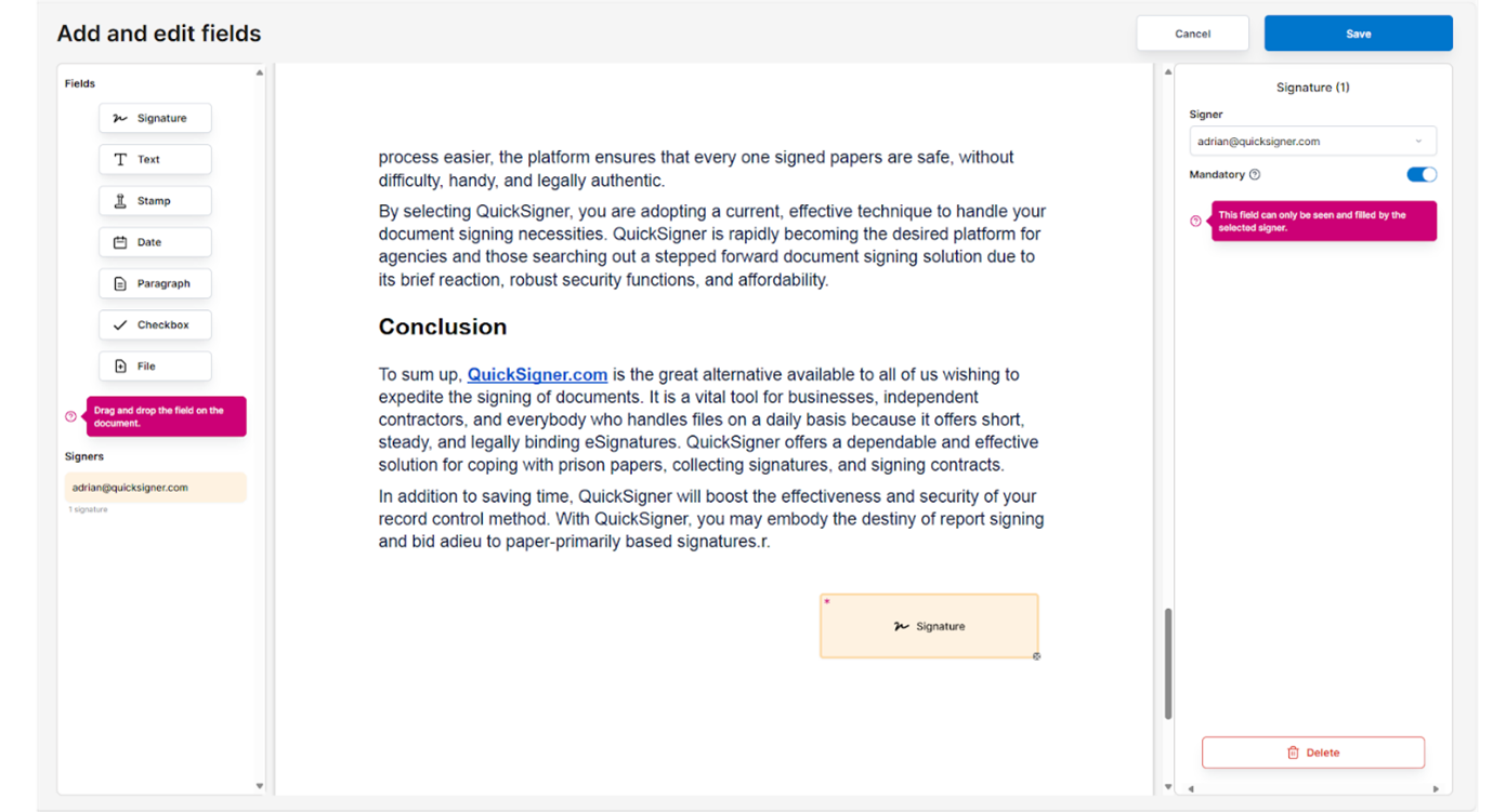 one of the thing i most liked about QUICKSIGNER is the simple API access so that everything can be automated with a click of a button.. The customer support received to help setup the API as newbie was amazing.. quick responses and great pricing for API usage.. overall great software and great team. Review collected by and hosted on G2.com.