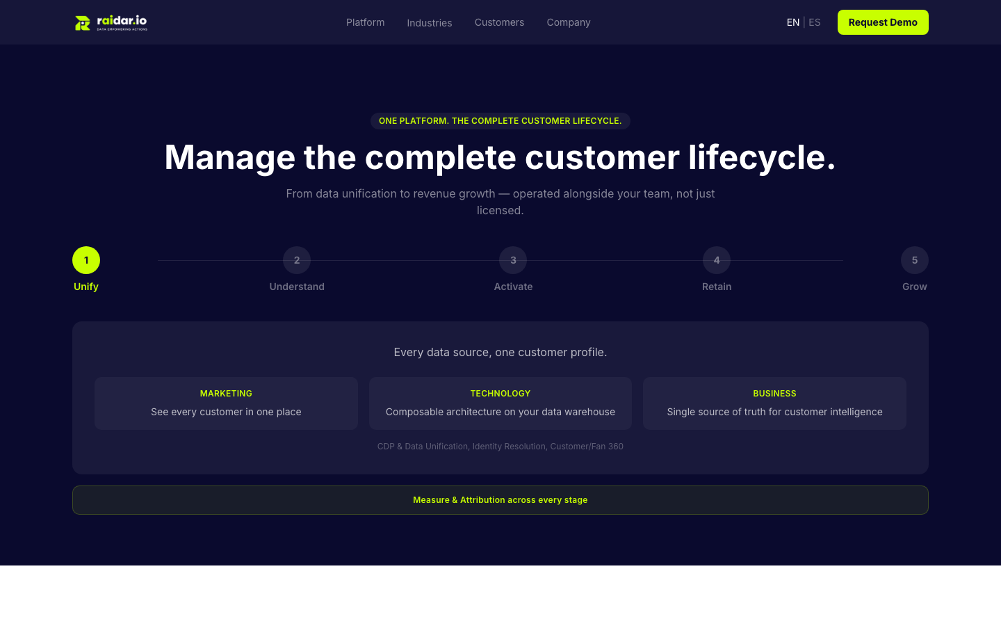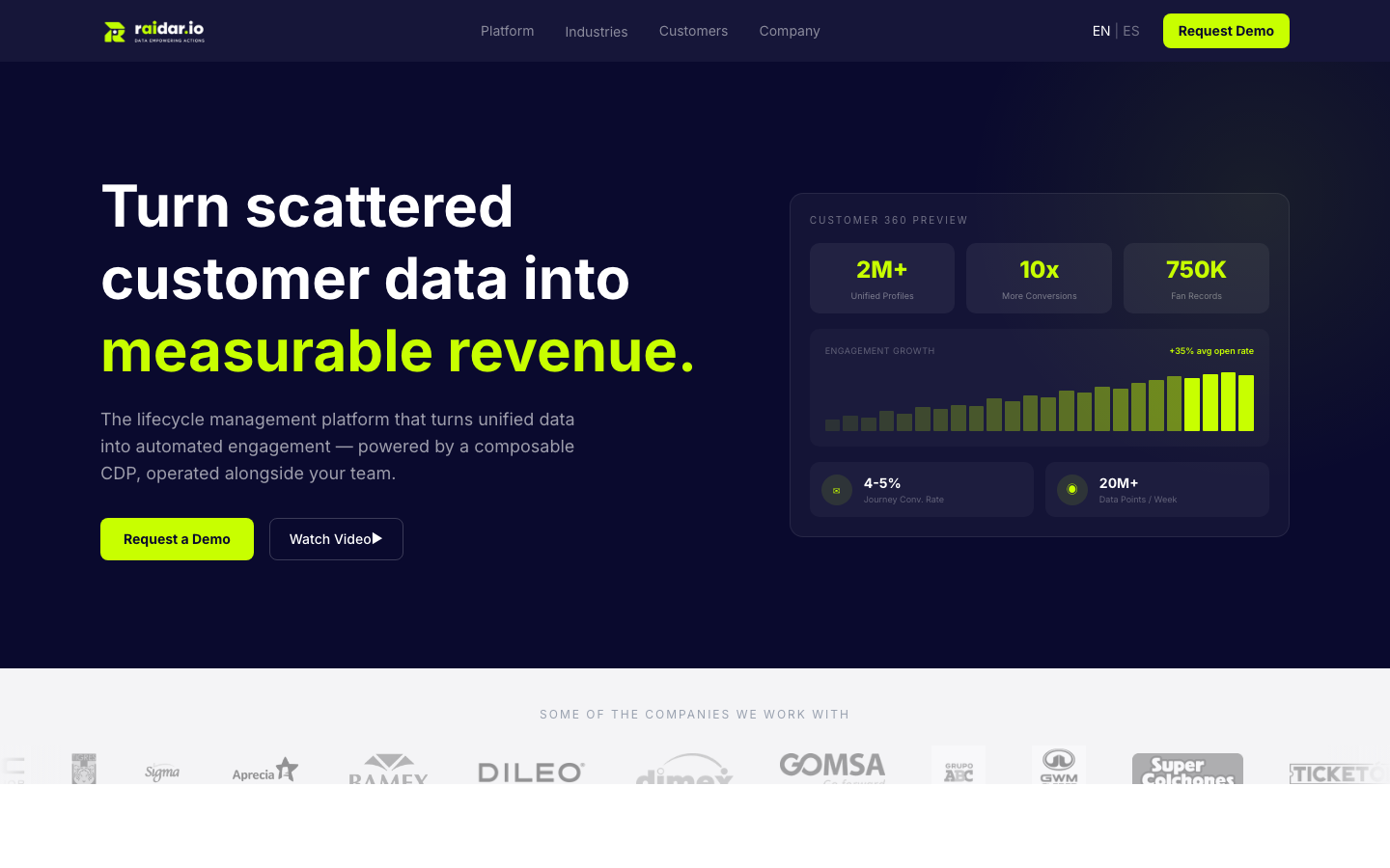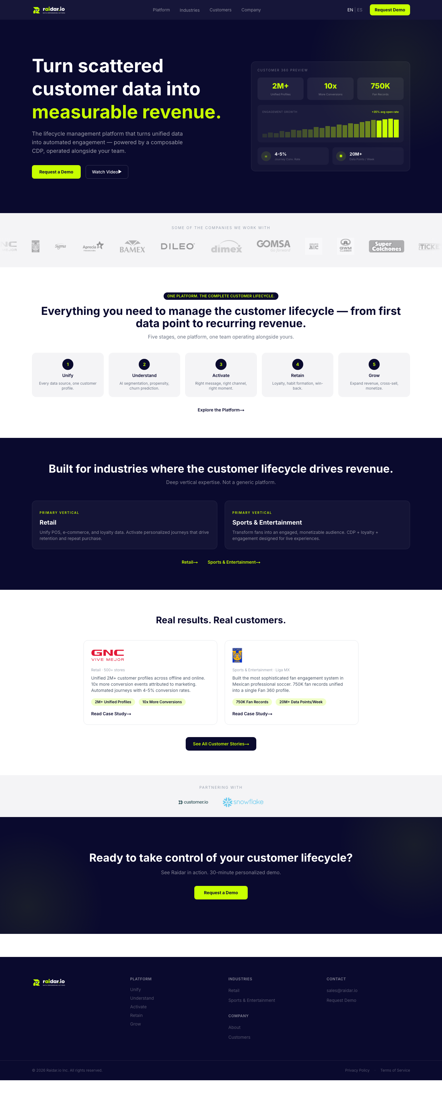 Raidar is a lifecycle management platform powered by a composable CDP. It unifies customer data from POS, e-commerce, loyalty, ticketing, and digital interactions into a single Customer 360 profile, then activates it through automated journeys, AI-driven segmentation, and loyalty programs that drive measurable revenue.