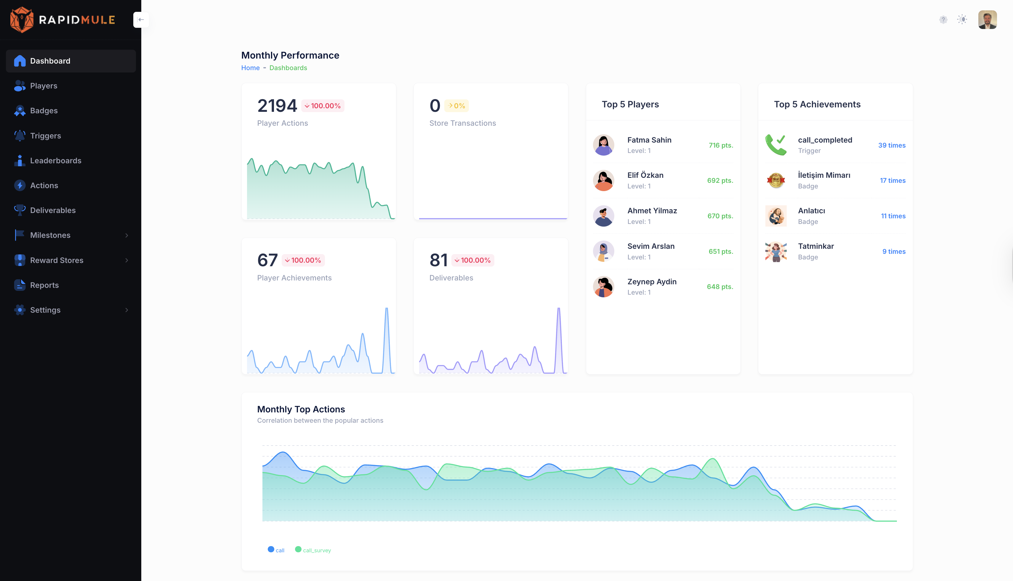 RapidMule provides a modular interface that allows users to design and deploy gamified flows using predefined templates, custom rules, and event-driven triggers. The platform integrates with existing systems such as CRMs, internal portals, or customer-facing apps, allowing for seamless data synchronization and real-time response to user actions.
