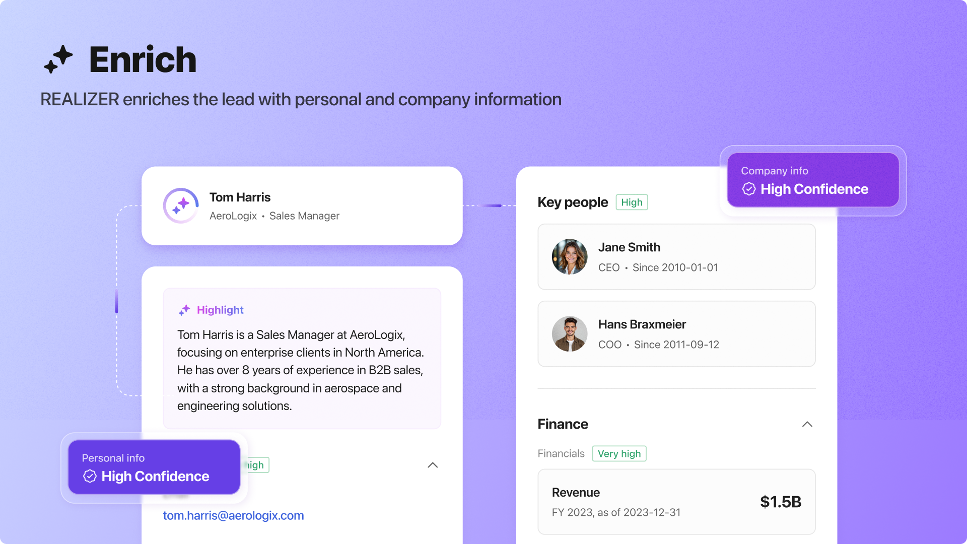 What I like best about REALIZER is how it eliminates the manual grind of lead management. At events, our team used to spend hours entering business cards, researching contacts, and preparing follow-ups. Now, with just a quick scan or email entry, REALIZER instantly enriches the contact with career history, company data, and even news updates. It feels like we gained an AI assistant who saves us days of work and ensures our follow-ups are timely and relevant. Review collected by and hosted on G2.com.