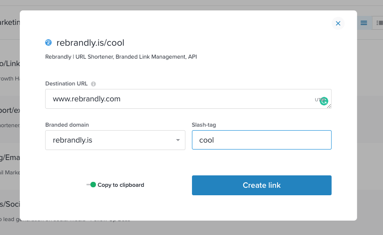 I like Rebrandly's URL shortener because it looks like a link that's come directly from my brand -- there's no 'google' or 'bitly' add on, and it makes my audience feel more comfortable that the link we're sharing is legit. The customization is key! Review collected by and hosted on G2.com.