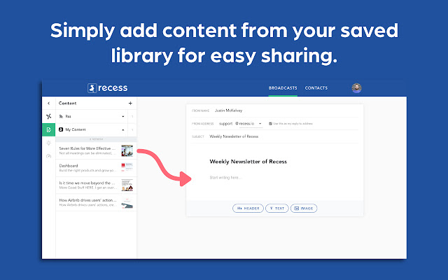 "Broadcasting our weekly/monthly communication in an easy to read free flowing format. Allowed us to modernize our communication from the less professional pdf attachment style of emails. Ability to track the view rate" - Recess Professional Customer
