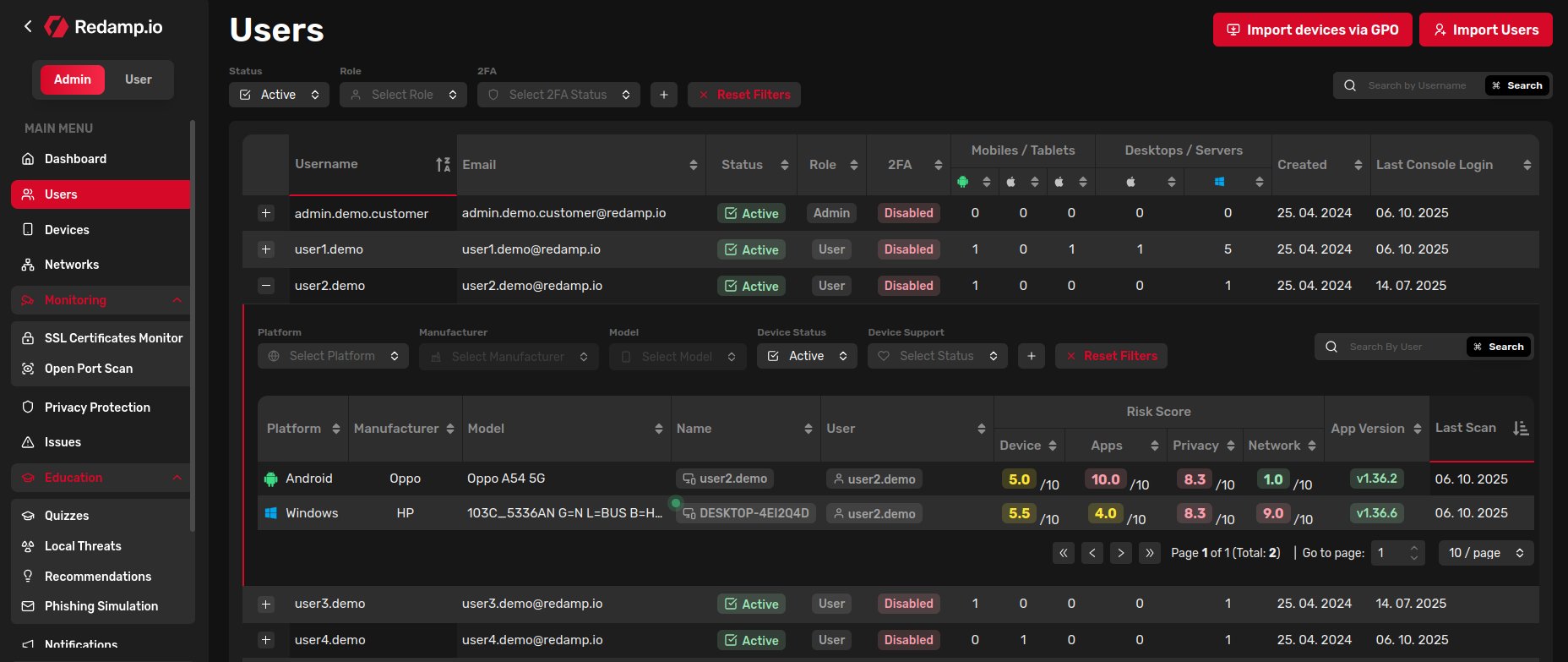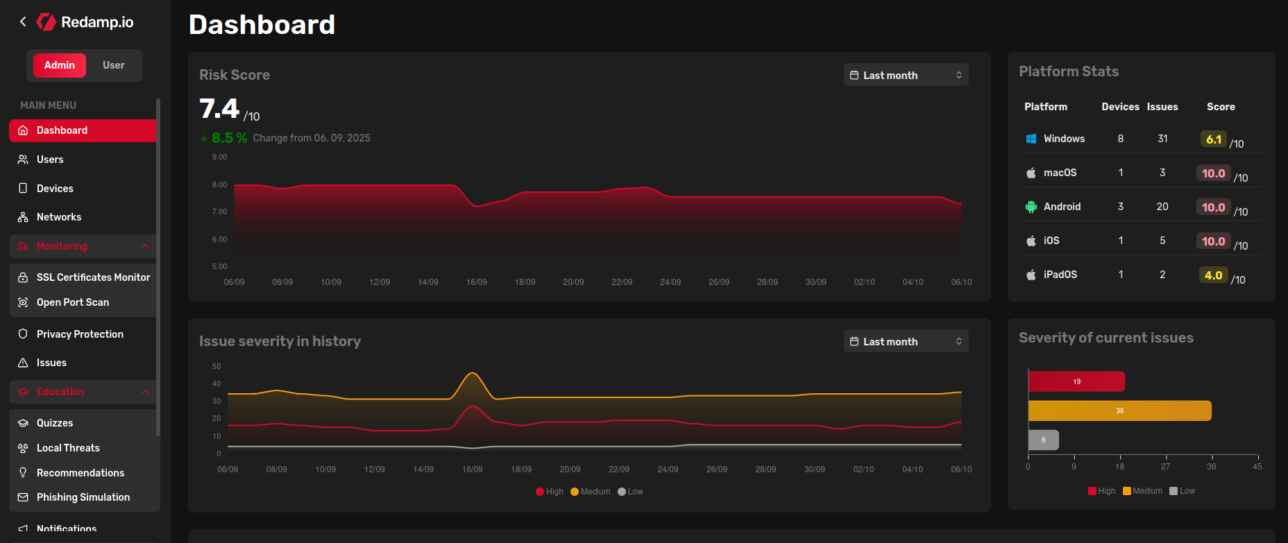 Redamp.io is a modern IT management and cybersecurity platform designed for small and medium-sized businesses that want full control and protection without the complexity. From one intuitive dashboard, users can monitor all devices, networks, and user accounts in real time, automate patch management, detect vulnerabilities, and enforce security policies across their organization. Built-in phishing simulations and interactive training modules help educate employees and strengthen overall security awareness. Redamp.io also includes compliance tools for frameworks like NIS2, enabling companies to stay aligned with modern cybersecurity standards. The platform requires no complex setup or installation, and new features like mobile device management, AI-driven threat detection, and vulnerability scanning are continuously being added. Whether you manage IT in-house or rely on external experts, Redamp.io provides the visibility, automation, and protection your business needs — all in one secure place.