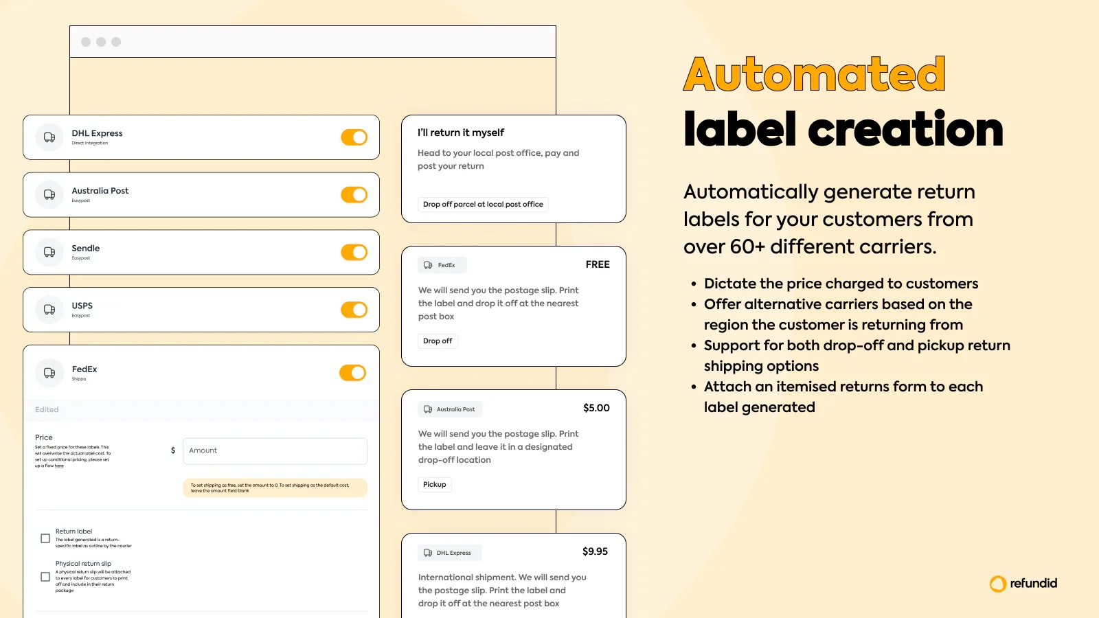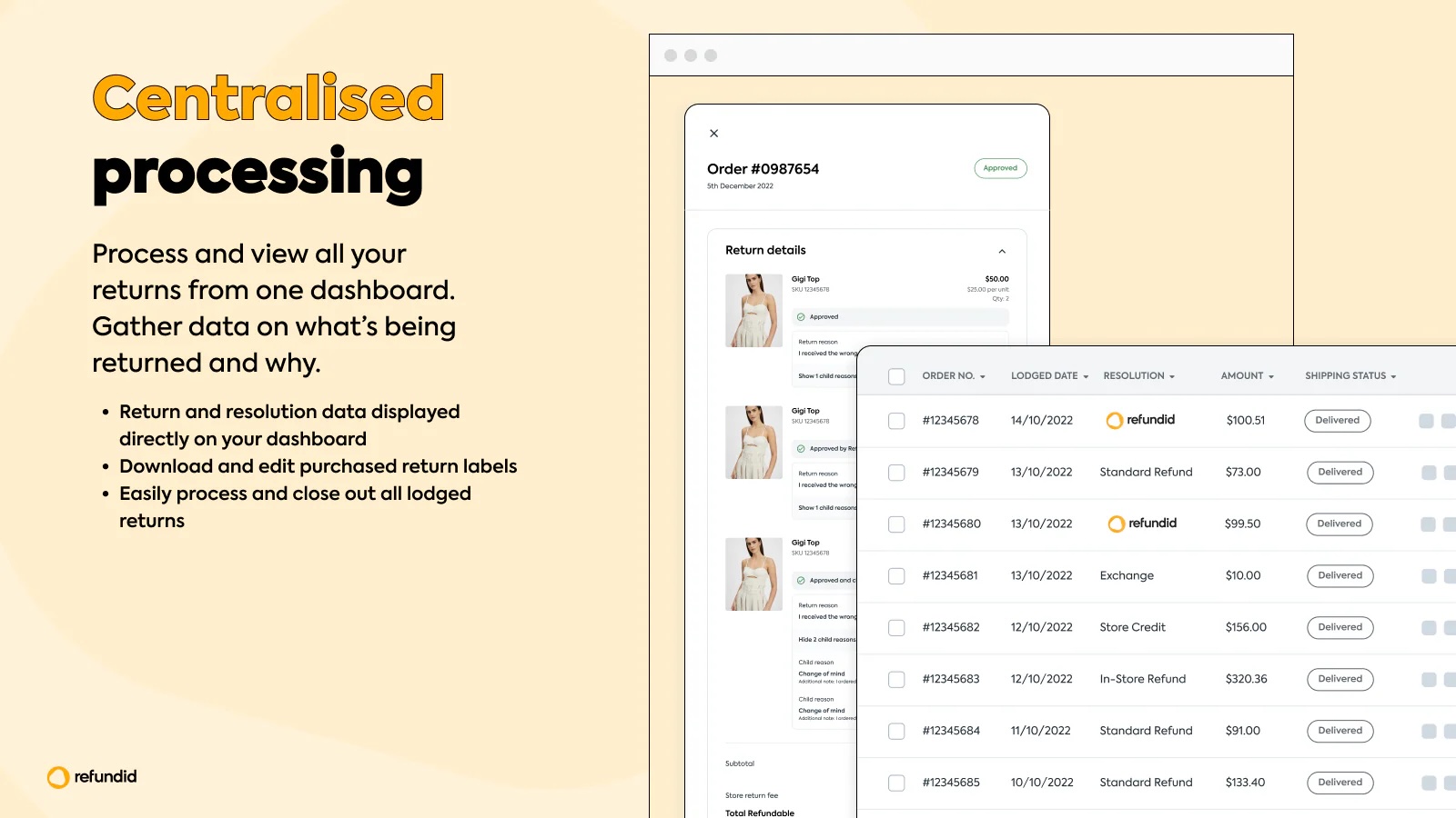 Refundid is the all-in-one returns platform. Offer instant or standard refunds and exchanges, plus store credit. Automate labels, integrate with carriers, and access real-time analytics to cut return rates. Streamline operations, gain insights, and deliver a seamless customer experience that drives repurchases.