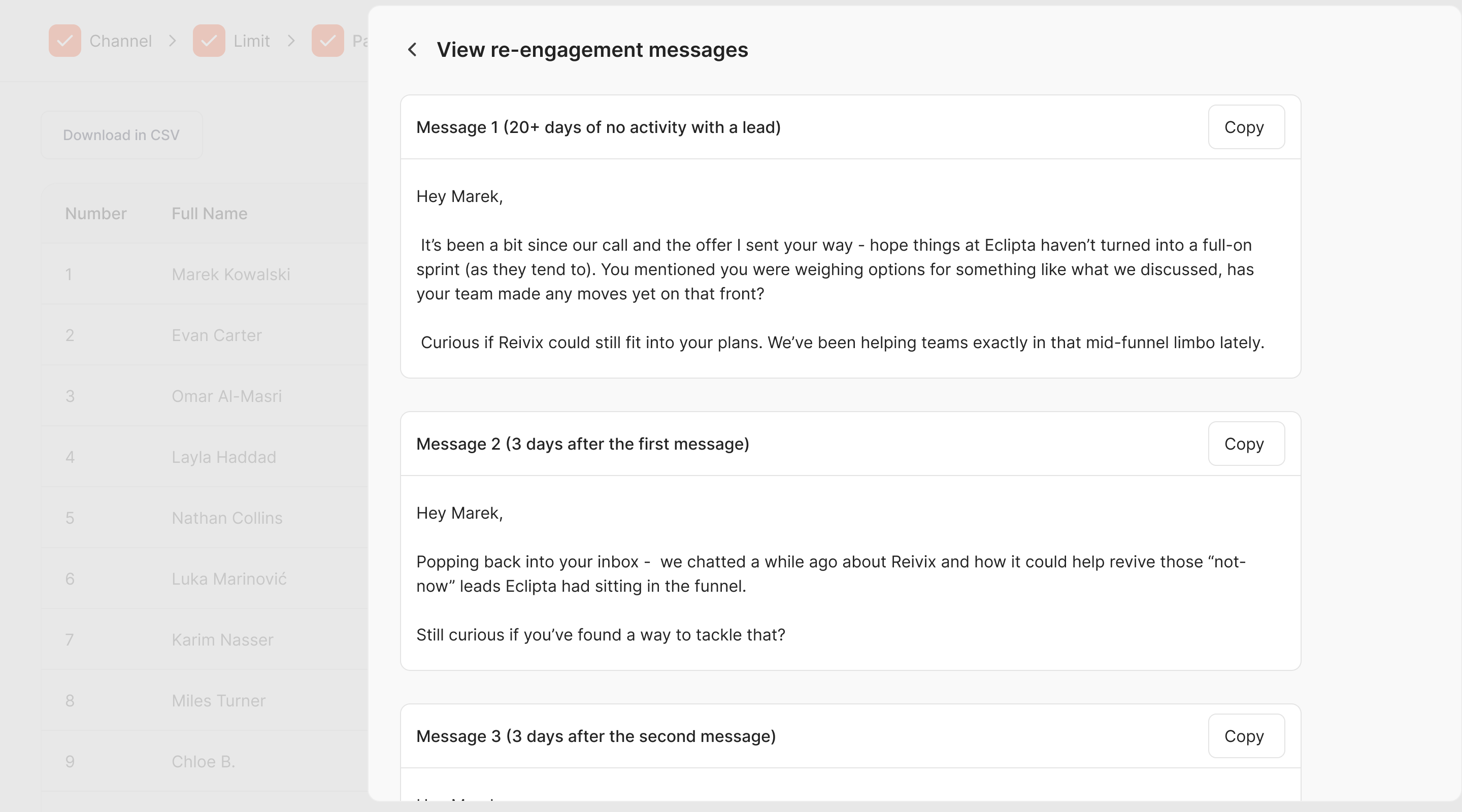 While most solutions focus on top-of-funnel outreach, Reivix goes deeper into your existing conversations. It monitors inboxes and LinkedIn DMs, identifies potential re-engagement opportunities, and generates contextual, personalized follow-up messages based on past interactions and any custom requirements.