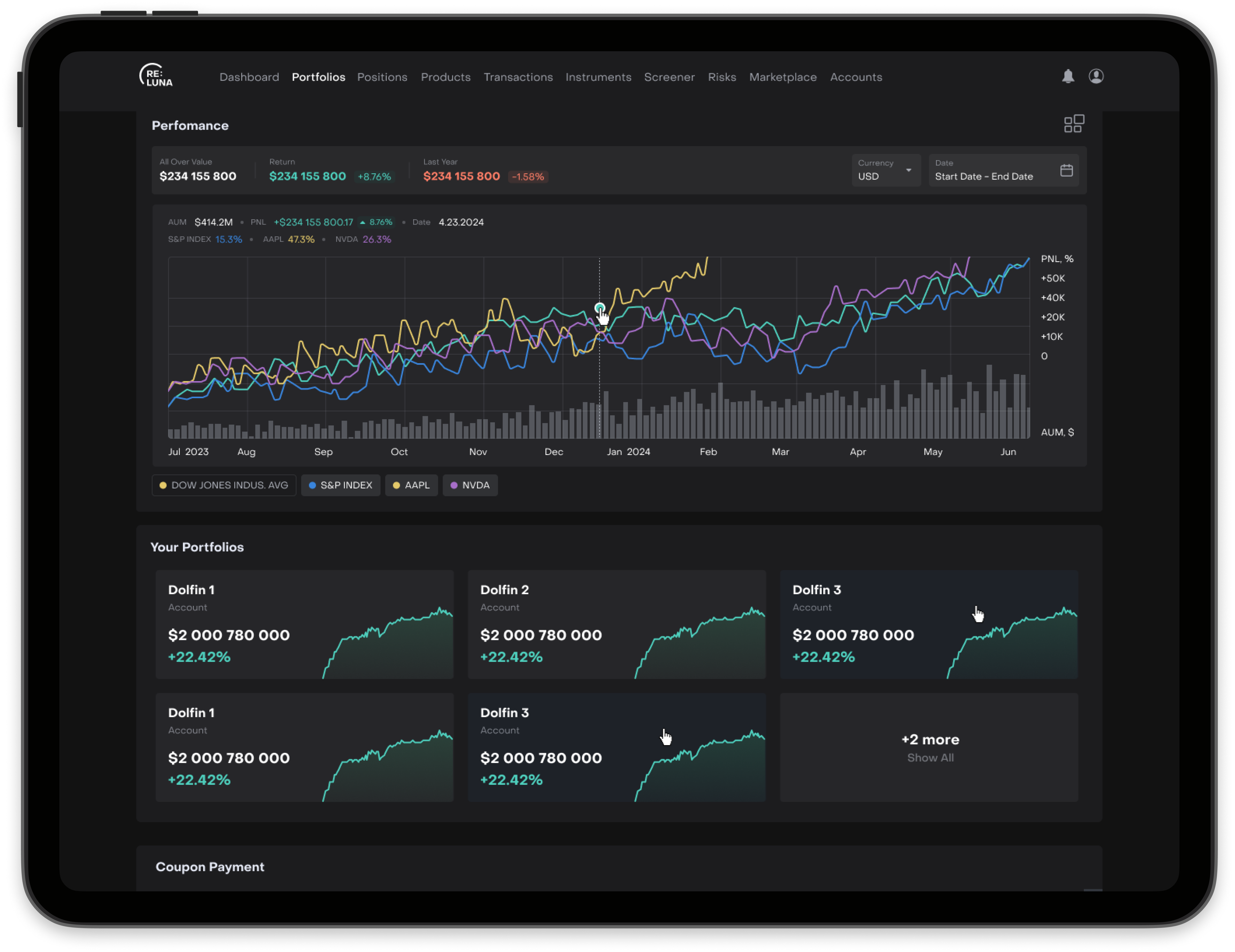 Koyfin is a modern and cost-effective financial analytics platform used by over 30,000 financial advisors and wealth managers. It provides tools to create model portfolios, analyze client portfolios, create client proposals, and research stocks, ETFs, mutual funds, and macroeconomic data. Koyfin provides extensive financial data, customization options, and efficient workflows. Key Features: Portfolio Tracking and Analysis: Monitor and analyze model portfolios and client portfolios with advanced metrics and visualizations. Client Proposals and Reports: Create sleek, digestible client proposals and reports that are easy for ordinary investors to understand, unlike traditional tools that produce dense and complex reports. Comprehensive Research Tools: Research stocks, ETFs, and mutual funds. Access extensive macroeconomic data. Create Substitutions for Existing Portfolio Holdings: Identify and monitor substitution holdings to be prepared for model changes. Intuitive Interface: Simplifies complex data analysis with visualization tools. Collaboration: Easily share and collaborate on watchlists and portfolios with your team. Affordability: Offers a cost-effective solution with transparent pricing. For more information, sign up for free at koyfin.com or contact help@koyfin.com