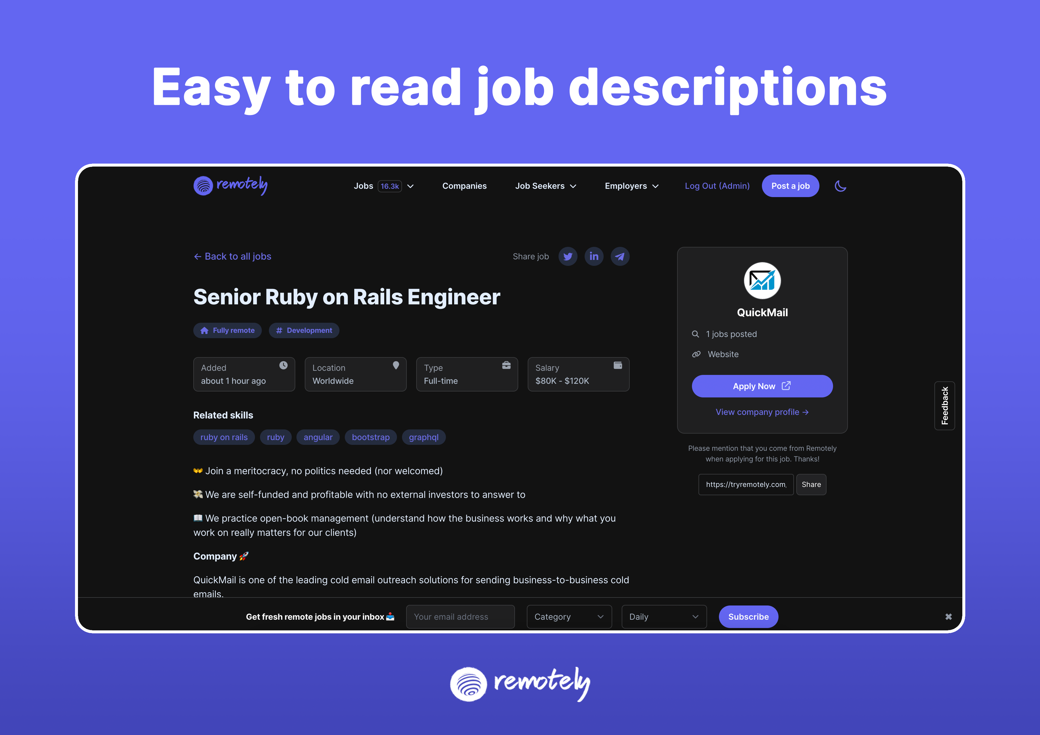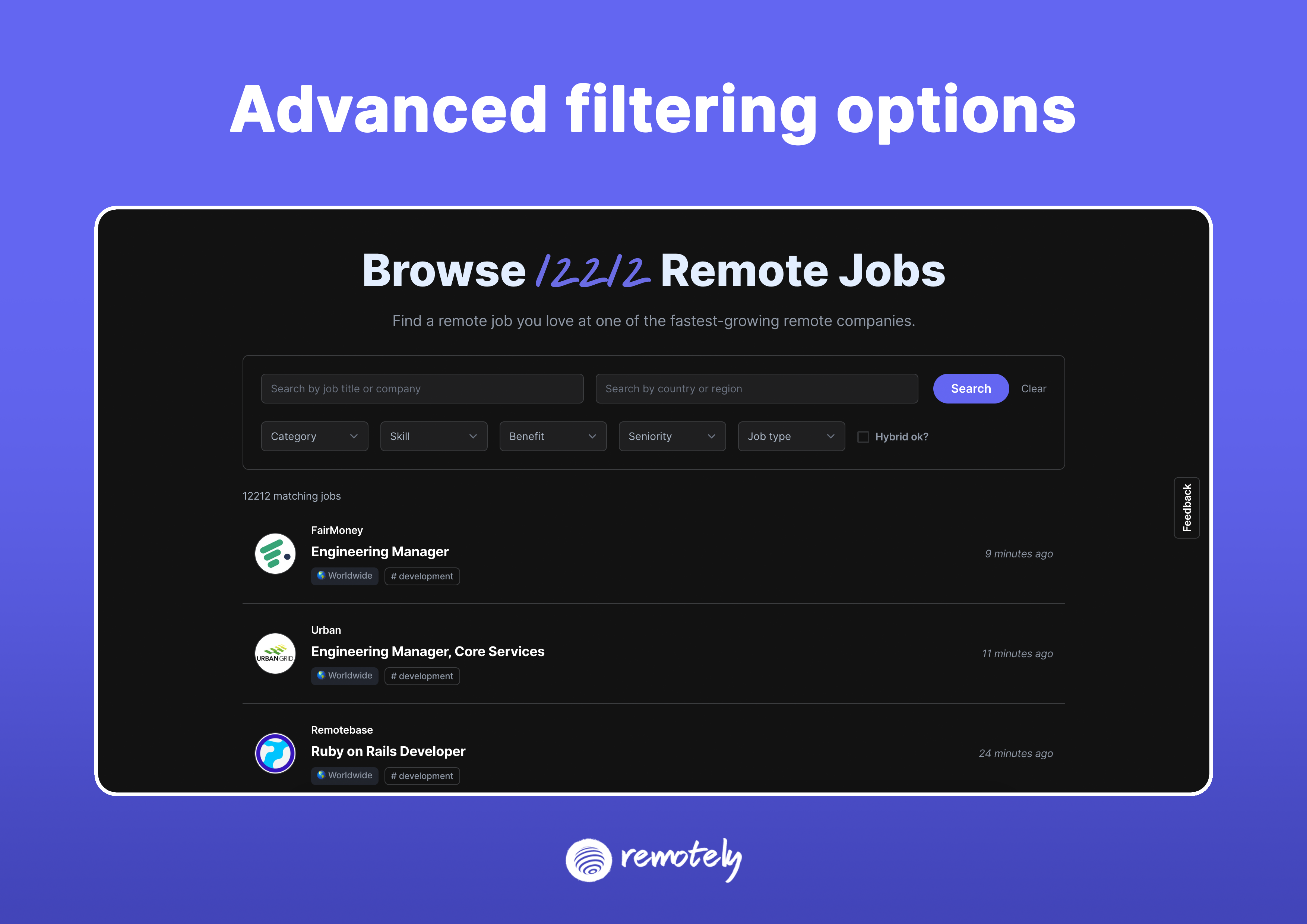Number of jobs posted in remotely are less likely which are not updated although it shows the relevant jobs with outdated ones. Which are not currently hiring that's the major drawback of remotely Review collected by and hosted on G2.com.