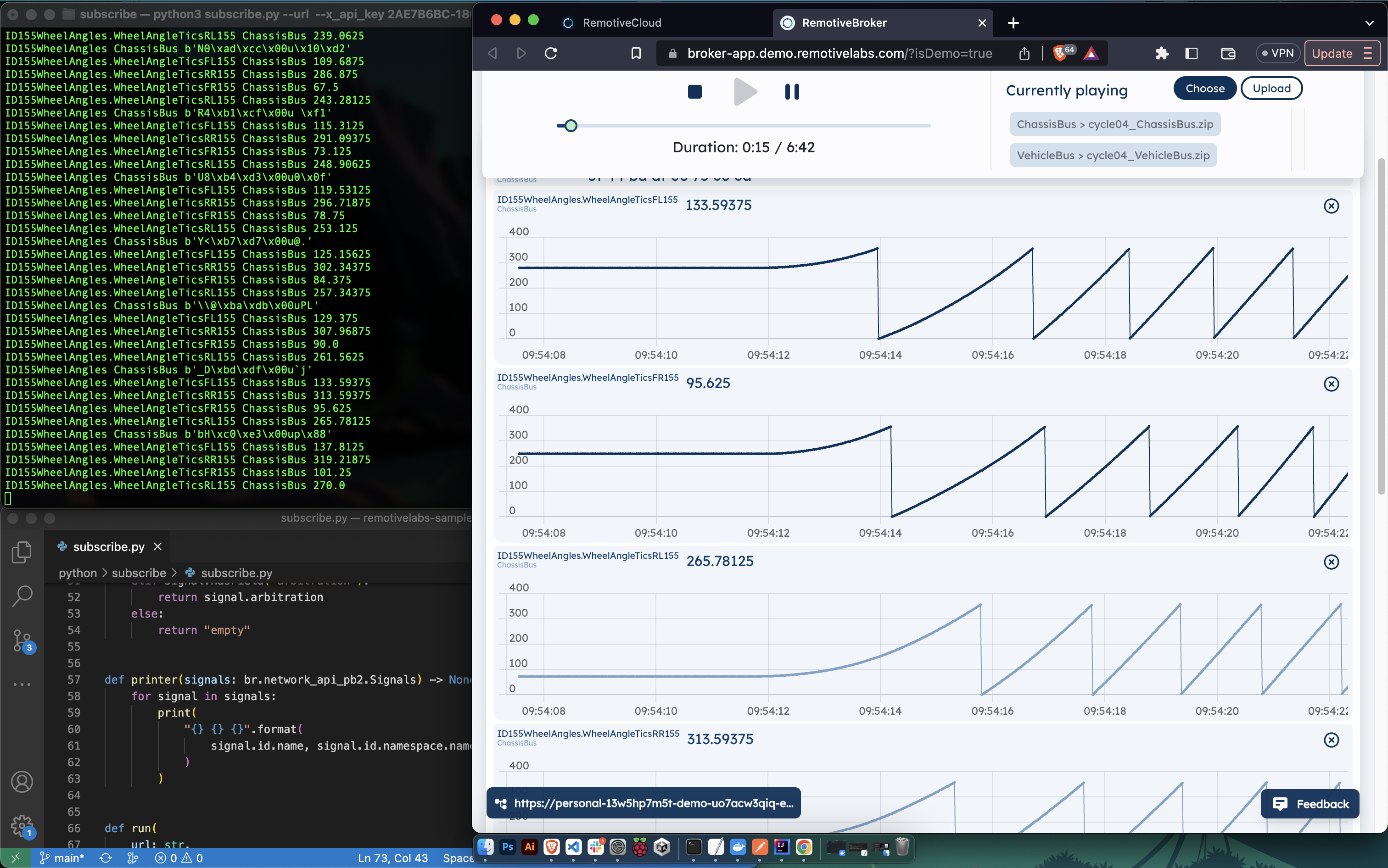 - Use the programming language of choice, e.g. Python, Rust, C++, read and write vehicle signal data through gRPC APIs. Use LUA scripting to transform (rename, map, merge or synthesize) signals emitted at custom frequency.