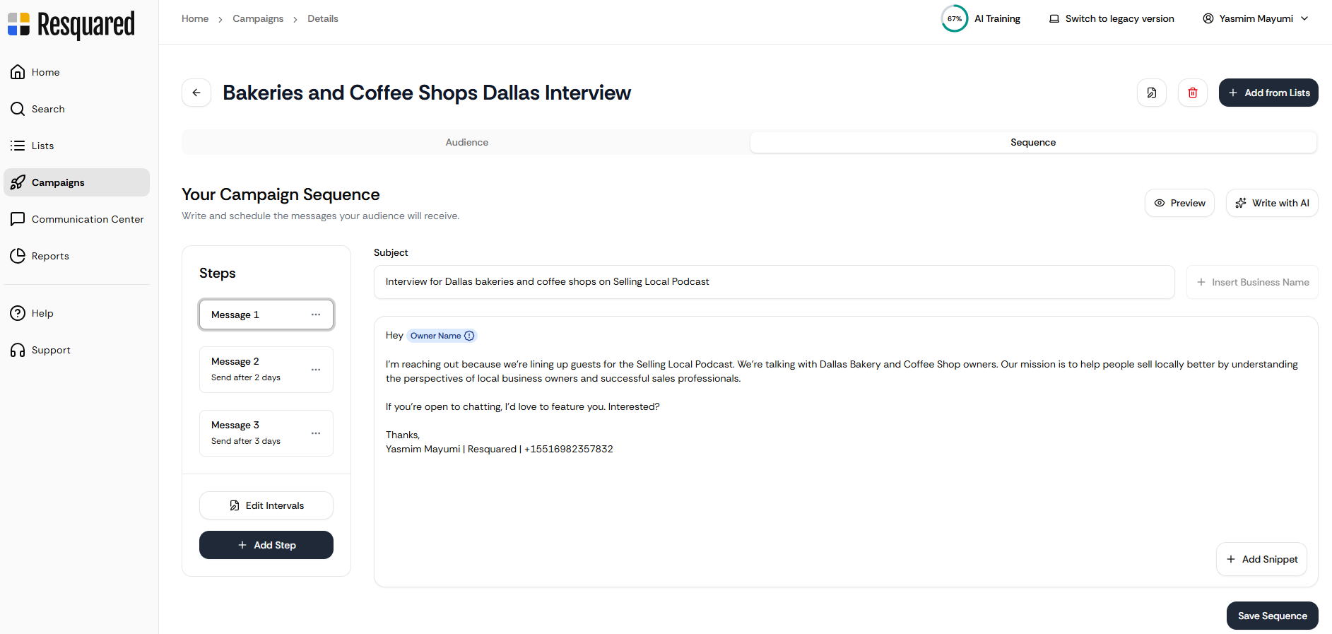 I like that Resquared allows me to reach a number of businesses efficiently and at an automated pace. The Resquared email sequence feature is valuable because it allows me to send out batches of emails that are both targeted and tailored. Review collected by and hosted on G2.com.