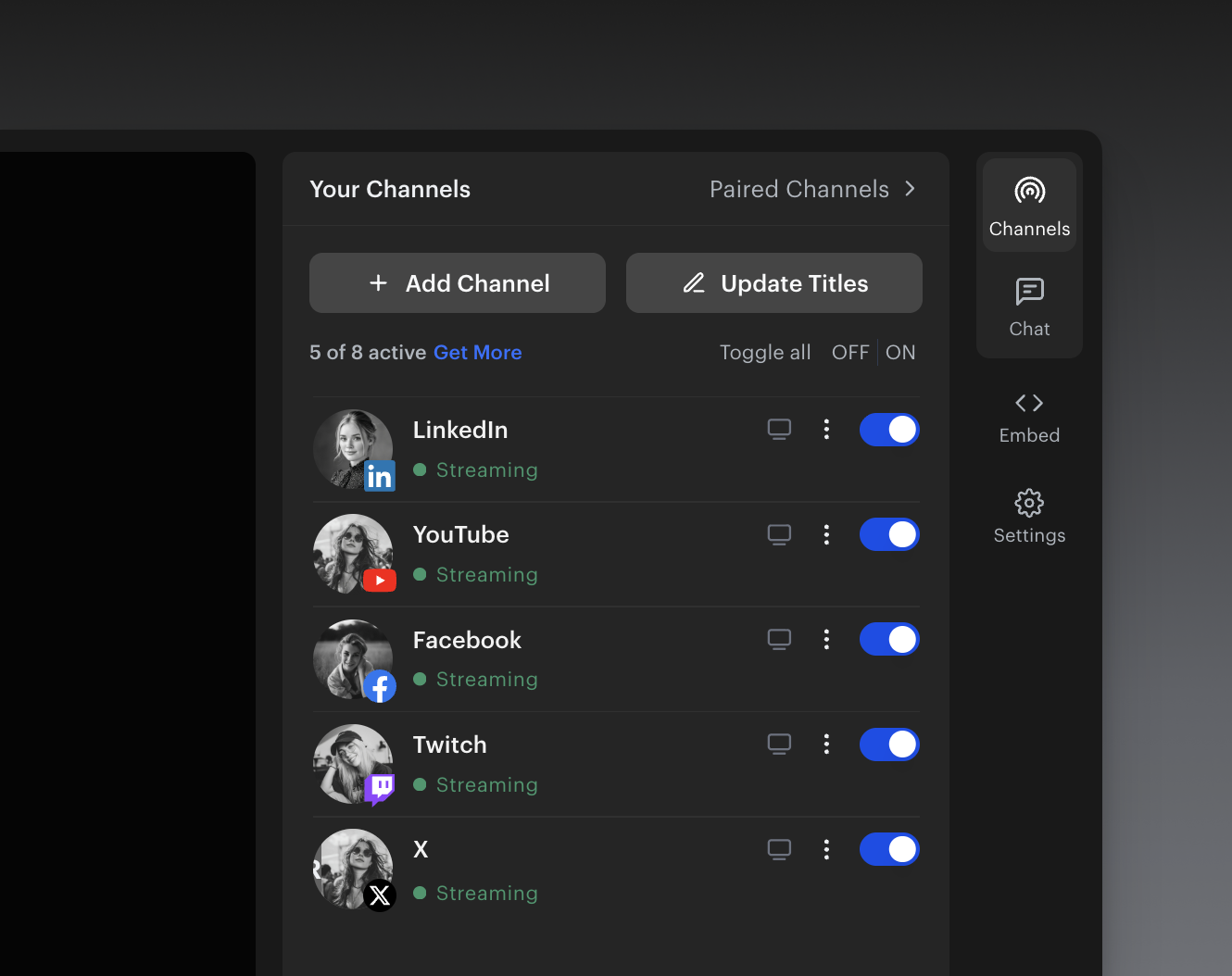 Multistreaming — reach your followers on every platform and read all live chats in one place. More platforms means more views every time you go live.