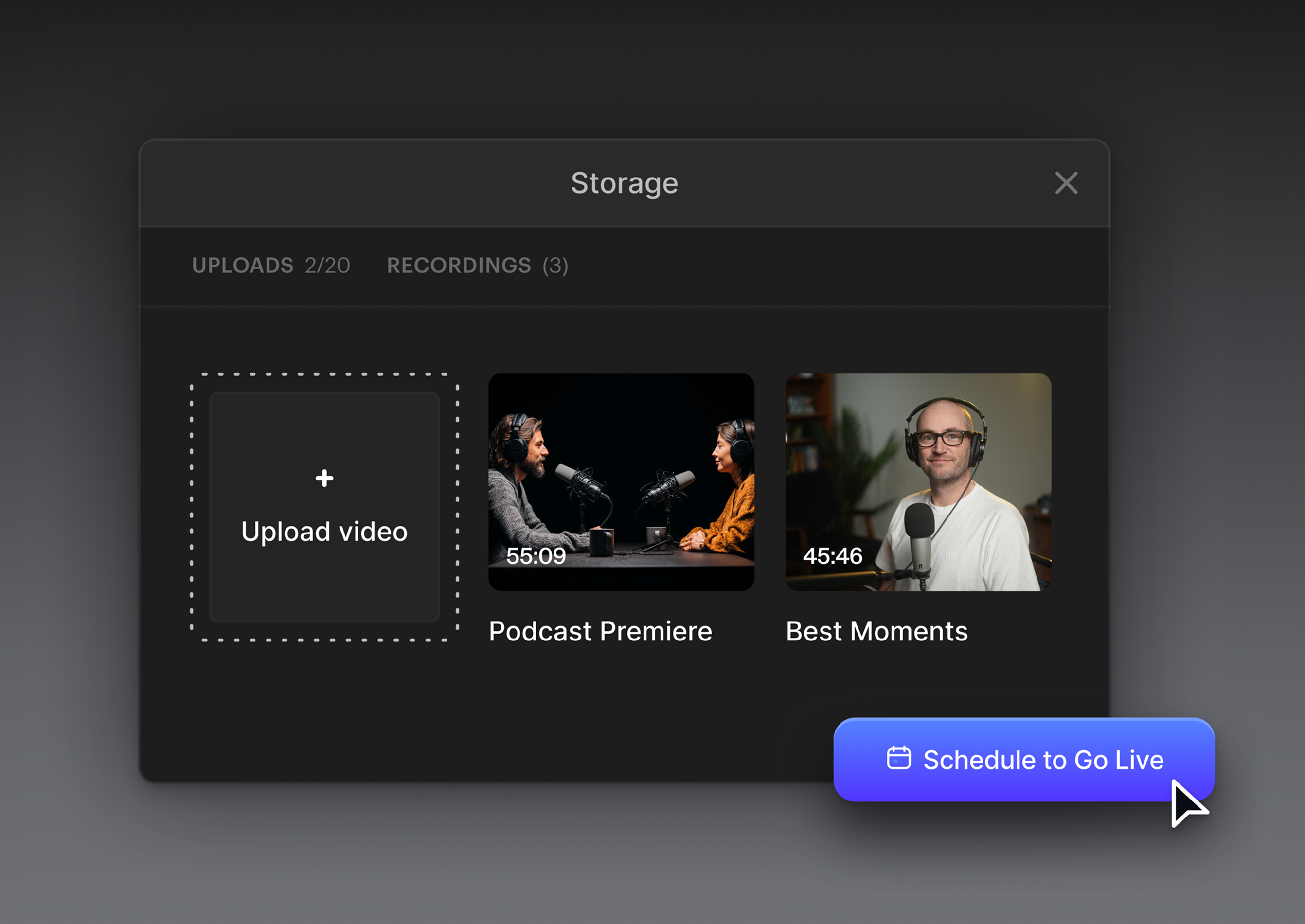 Upload & Stream — schedule pre-recorded videos as live content, with playlist creation and looping. Keep your channel always on, even when you're not.