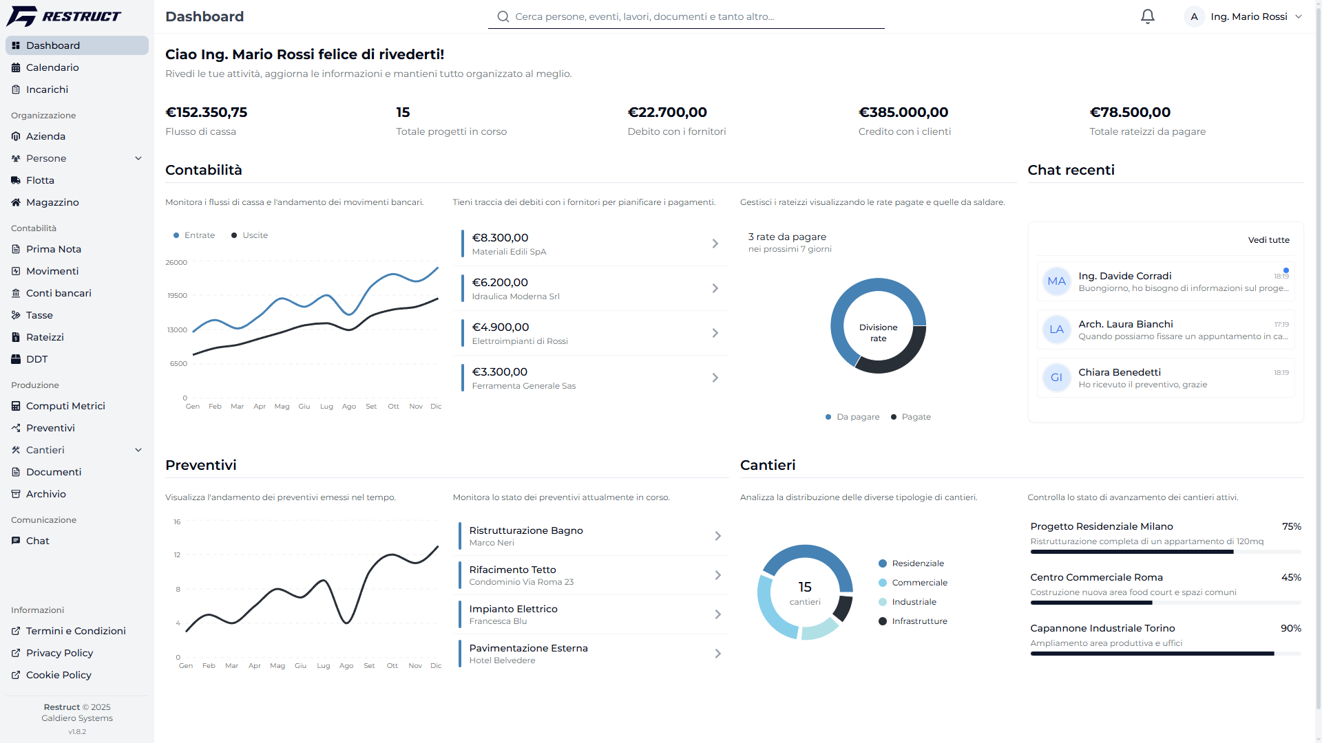 Restruct è la webapp gestionale all-in-one pensata per semplificare e digitalizzare ogni fase della gestione dei progetti nel settore delle ristrutturazioni e delle costruzioni. Dalla pianificazione iniziale alla contabilità, dal controllo dei cantieri al coordinamento del team, Restruct trasforma la complessità operativa in un flusso di lavoro chiaro, integrato ed efficiente.
