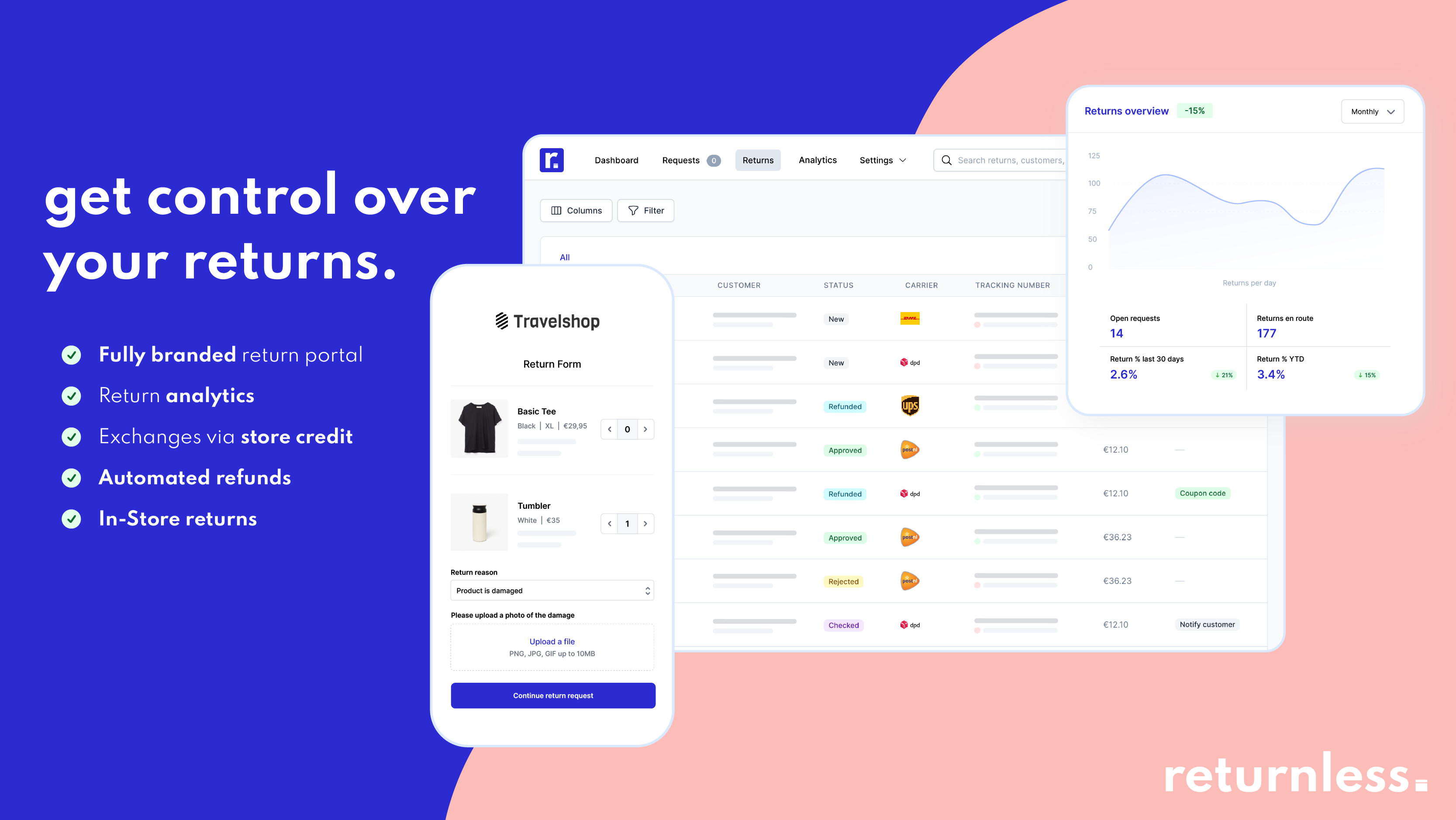 ReturnGO keeps your customers in the loop and creates a positive orders return and exchange experience. Configure your custom returns management portal to match your store policy rules.