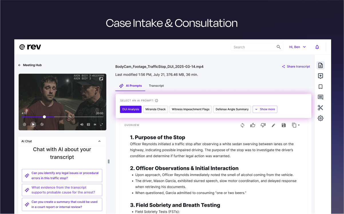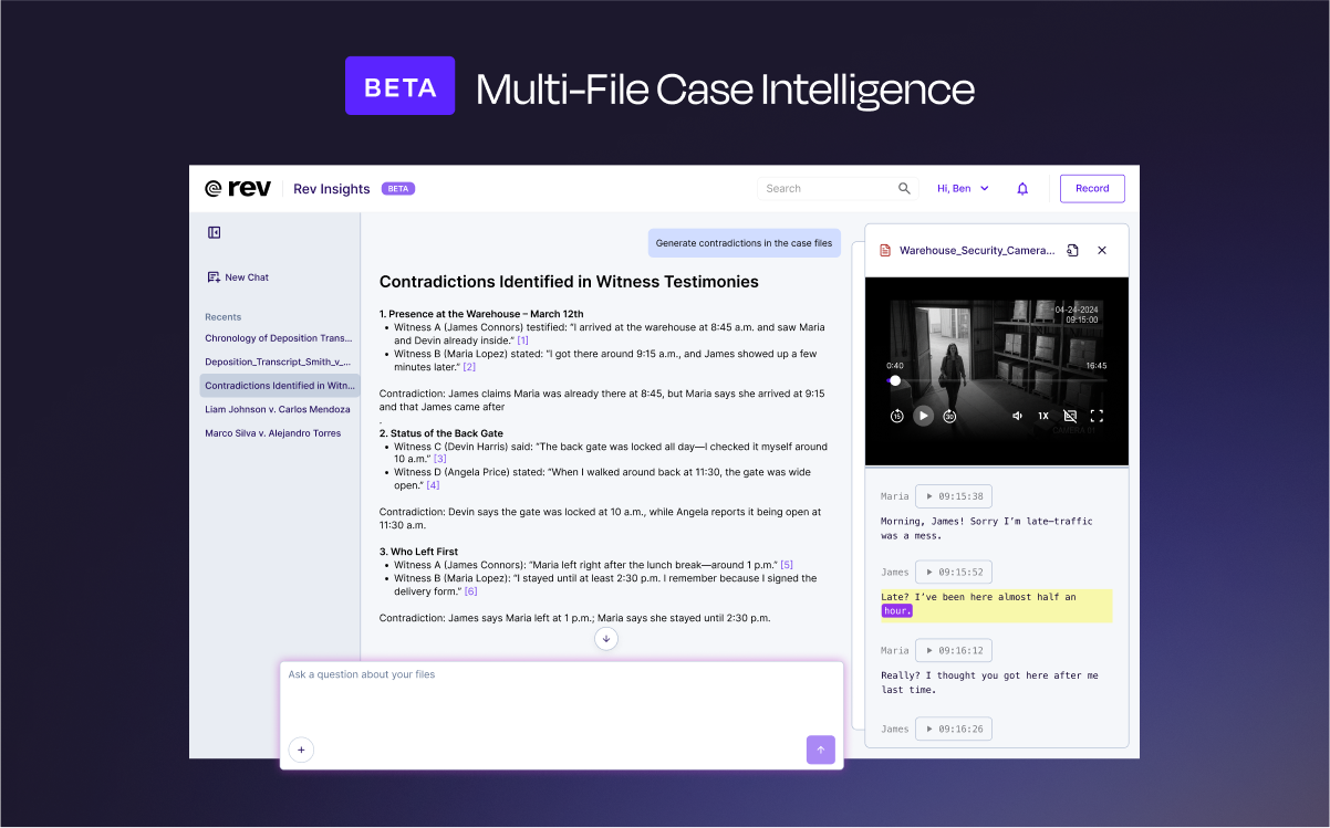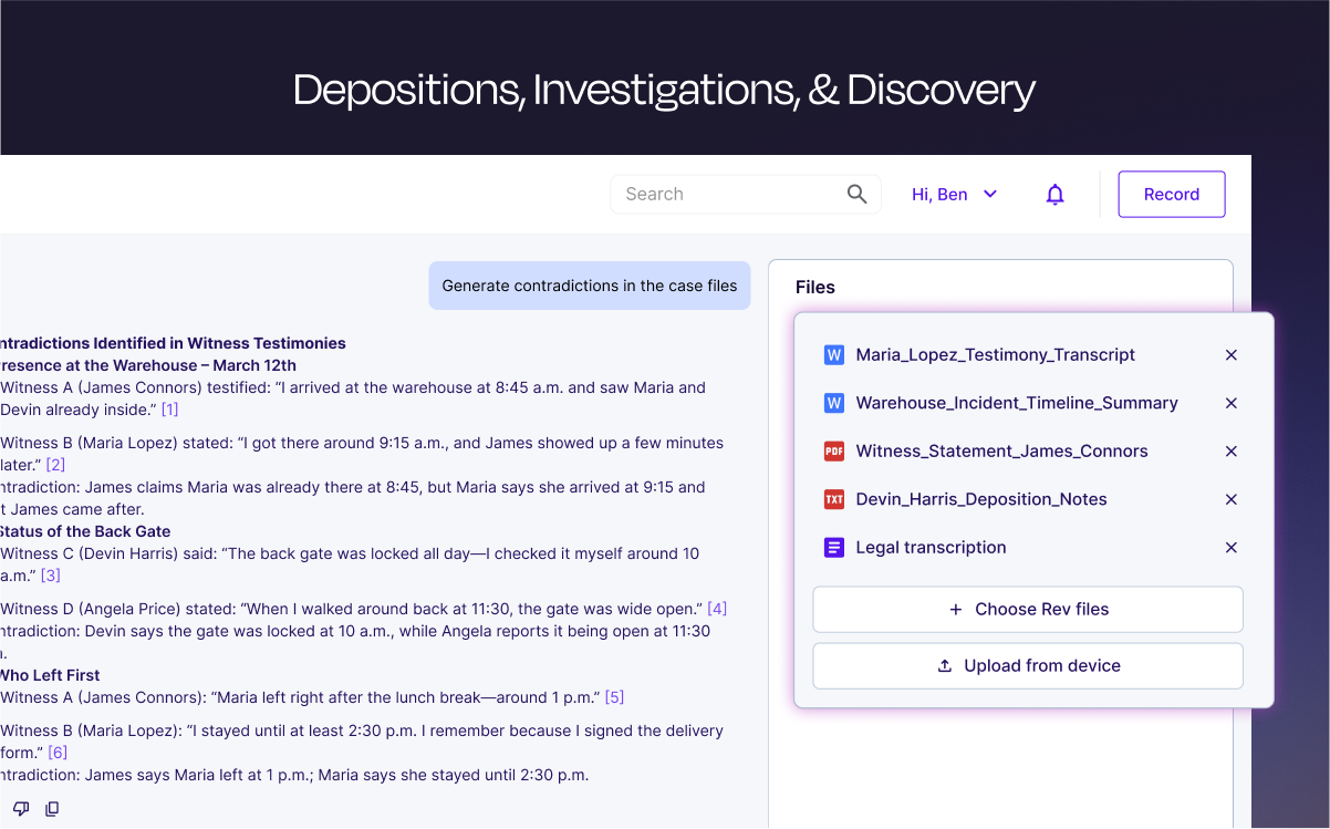 Rev helps legal professionals, journalists, and researchers capture, process, and use critical speech data. With 96%+ accurate AI transcription (upgradable to 99%+ with human review), Rev helps you work up to 120x faster by converting depositions, interviews, and recordings into searchable, usable text.
