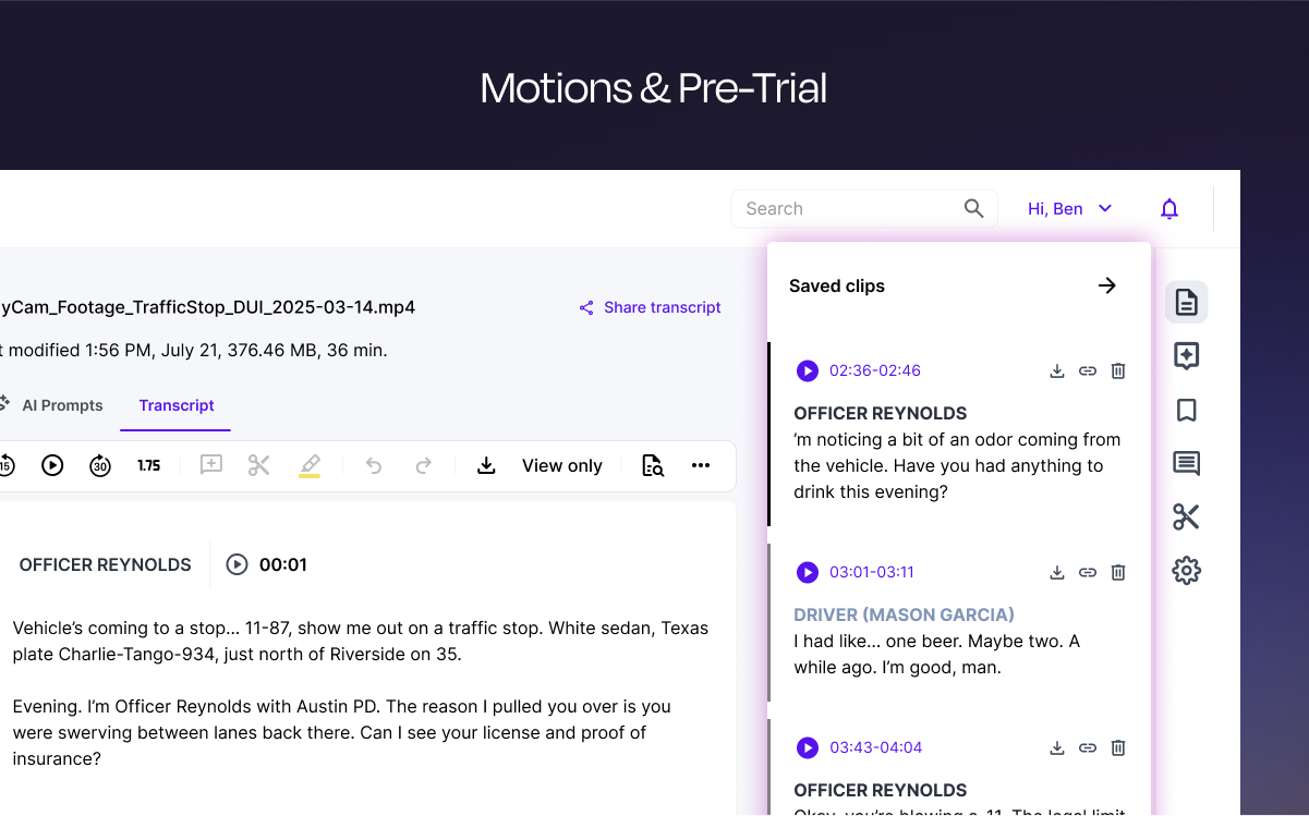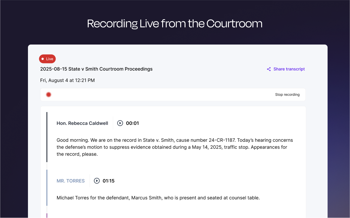 Record clear audio in courtrooms, field interviews, or research settings with the mobile app or automatically transcribe meetings and video calls through integrations with Zoom, Teams, Google, and other platforms. Never miss important details again.