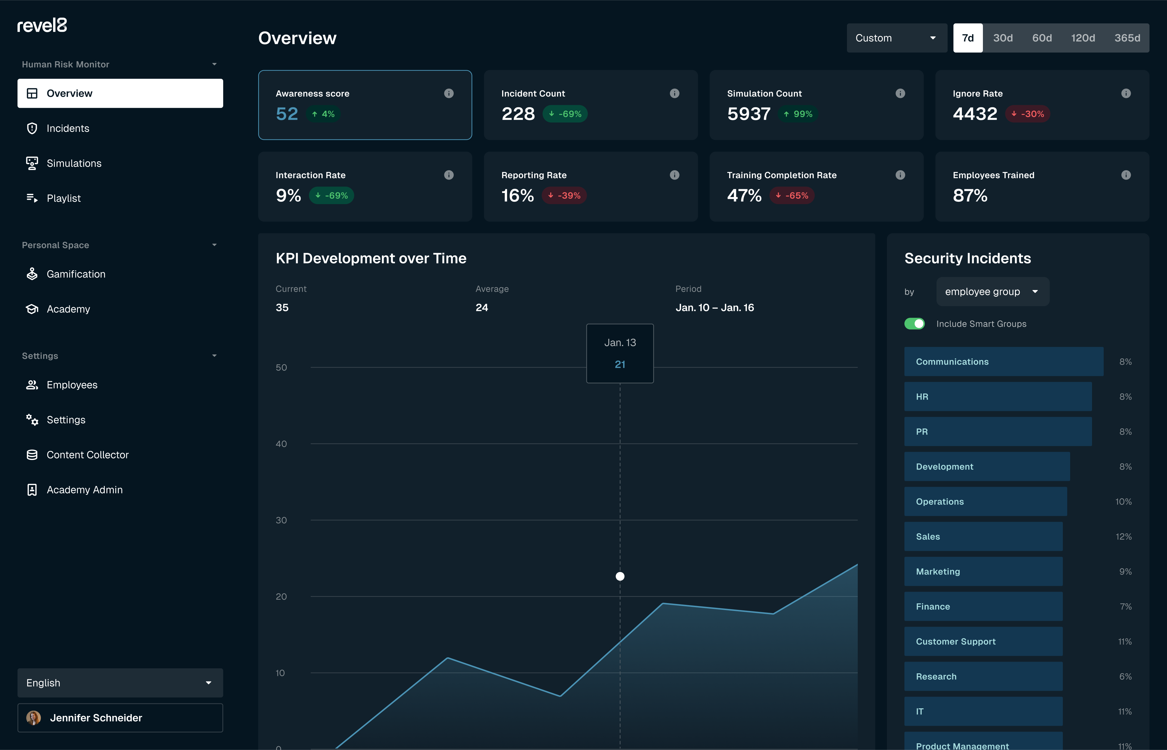 With revel8, security teams prepare employees using OSINT-based risk profiling and an adaptive “simulation playlist” that personalizes content by role, behavior, and exposure. Simulations span email, SMS, voice calls, video chat , and social media, and the platform replicates new attack methods in hours, keeping training aligned with the evolving threat landscape.