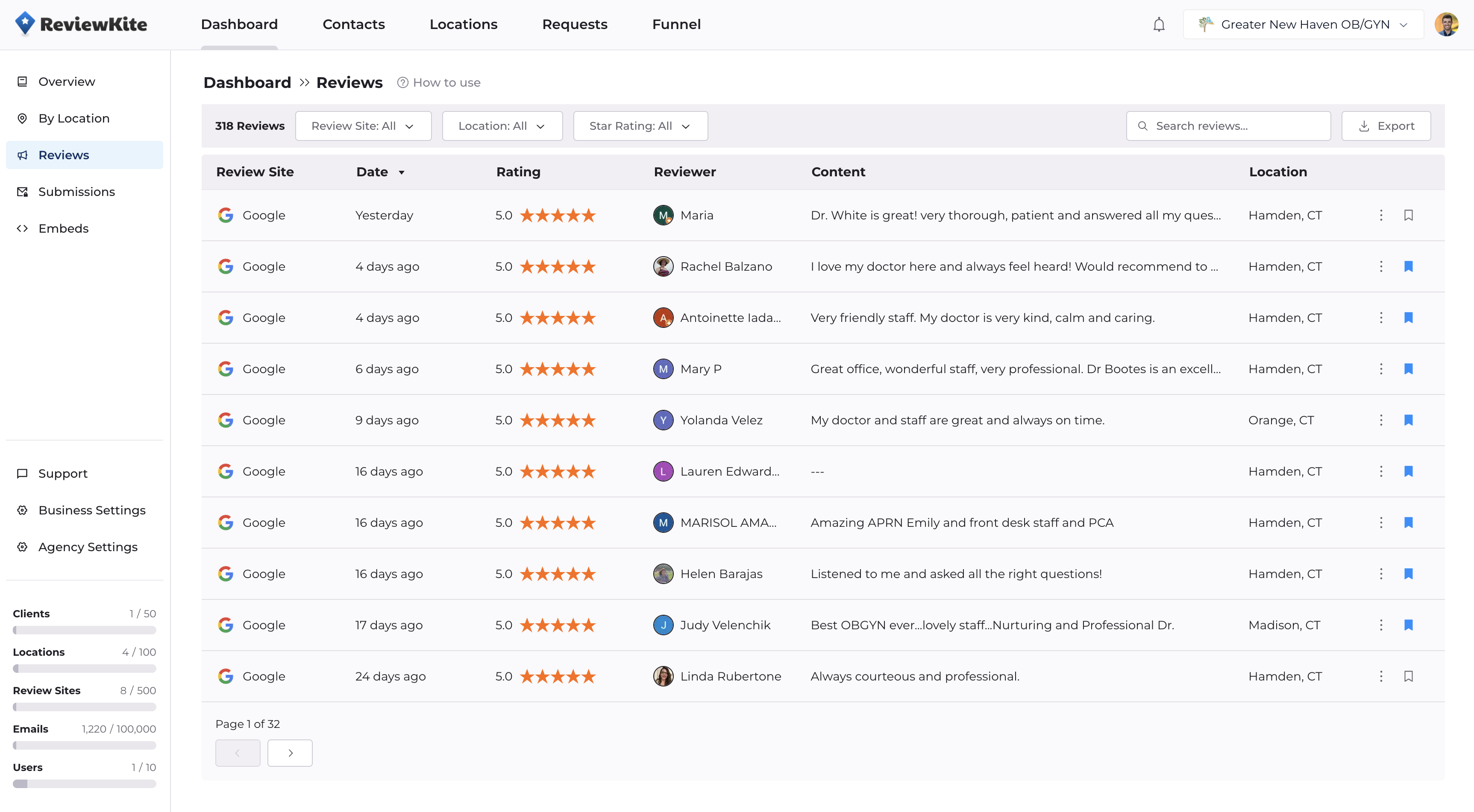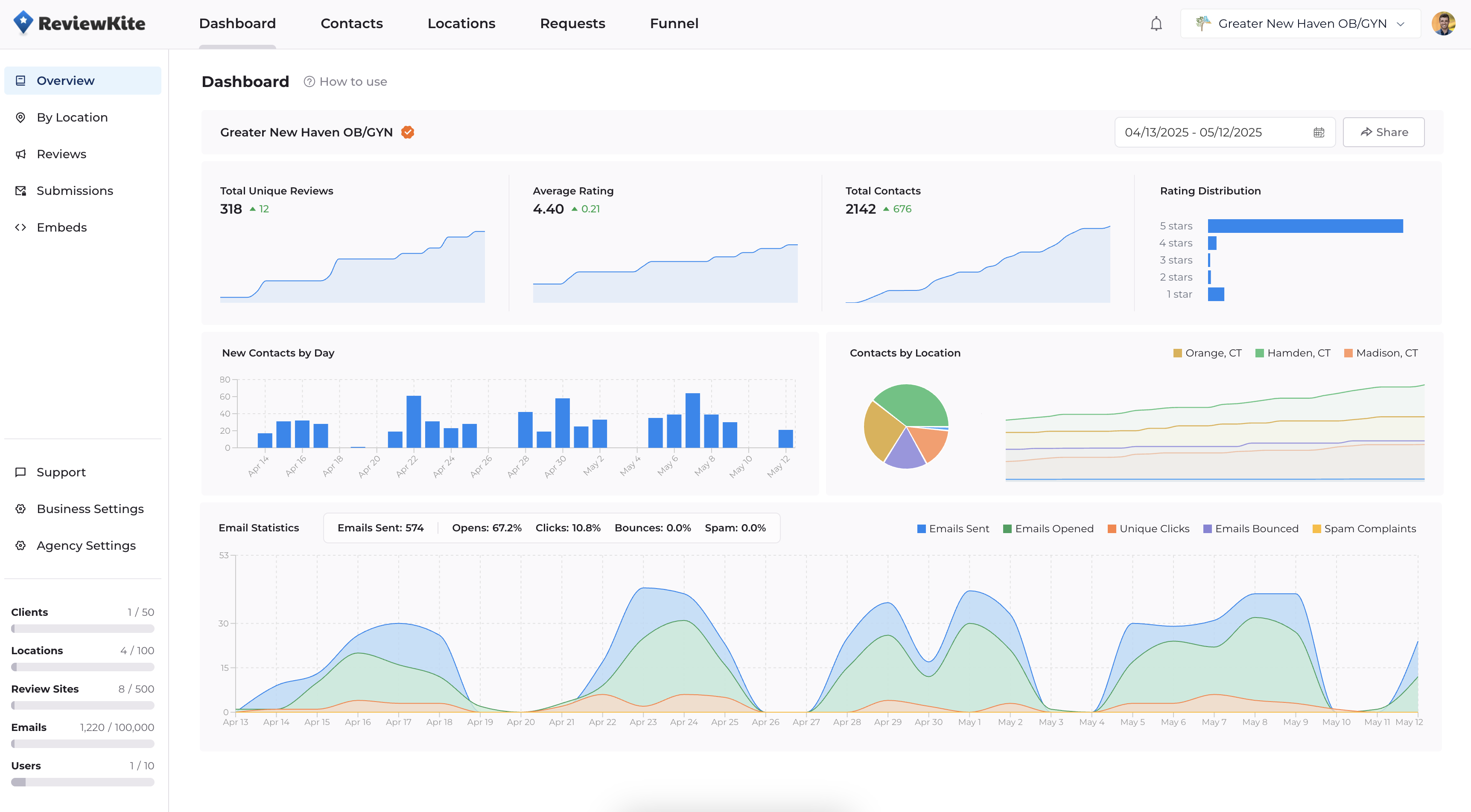 The ReviewKite dashboard provides agencies with a comprehensive overview of their clients' online reputation. It consolidates key metrics such as review volume, average ratings across multiple platforms, and campaign performance statistics, enabling agencies to monitor and manage their clients' o...