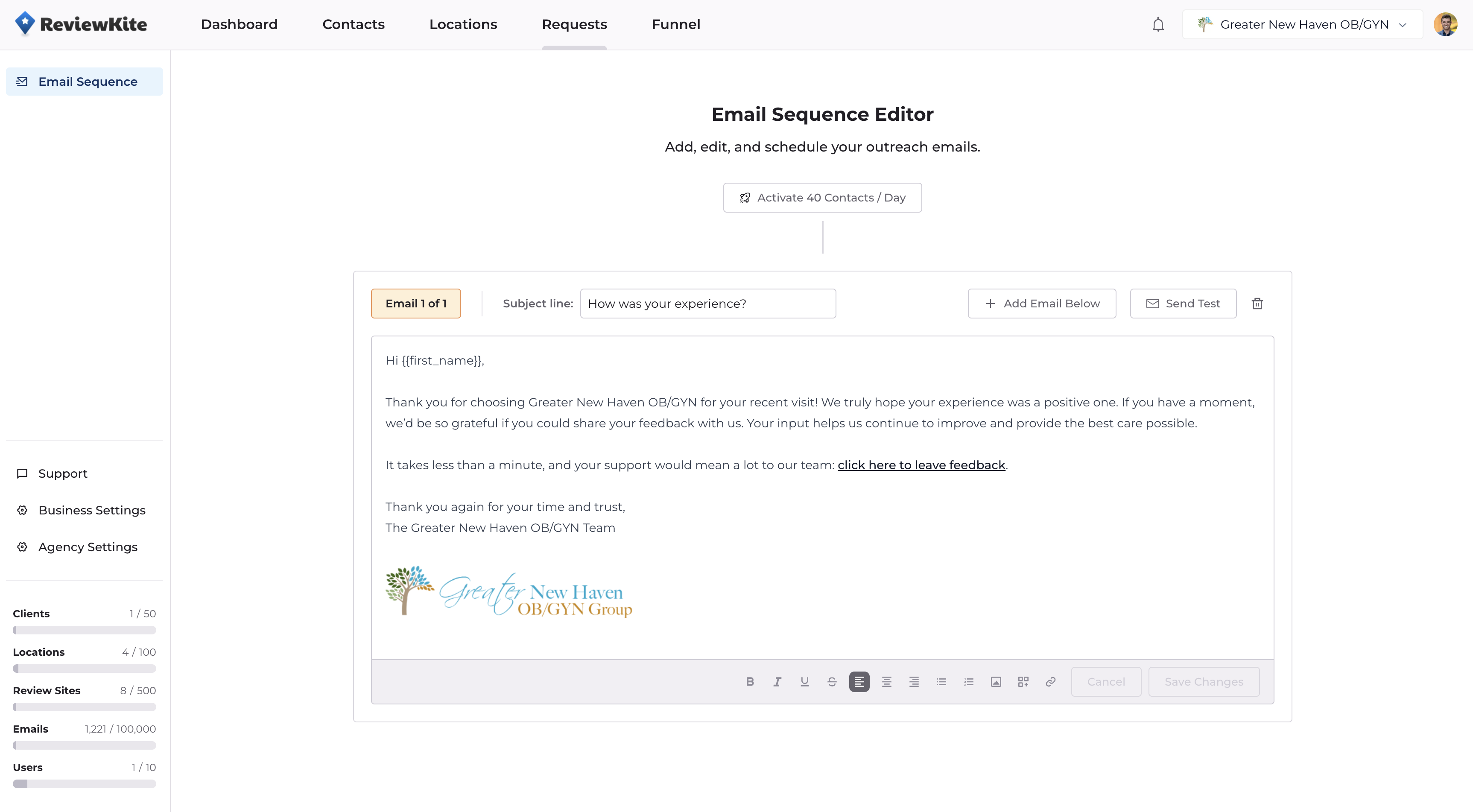 The Email Sequence Editor allows agencies to design and automate their review request email campaigns. Users can configure the email sending schedule, personalization snippets, and more.