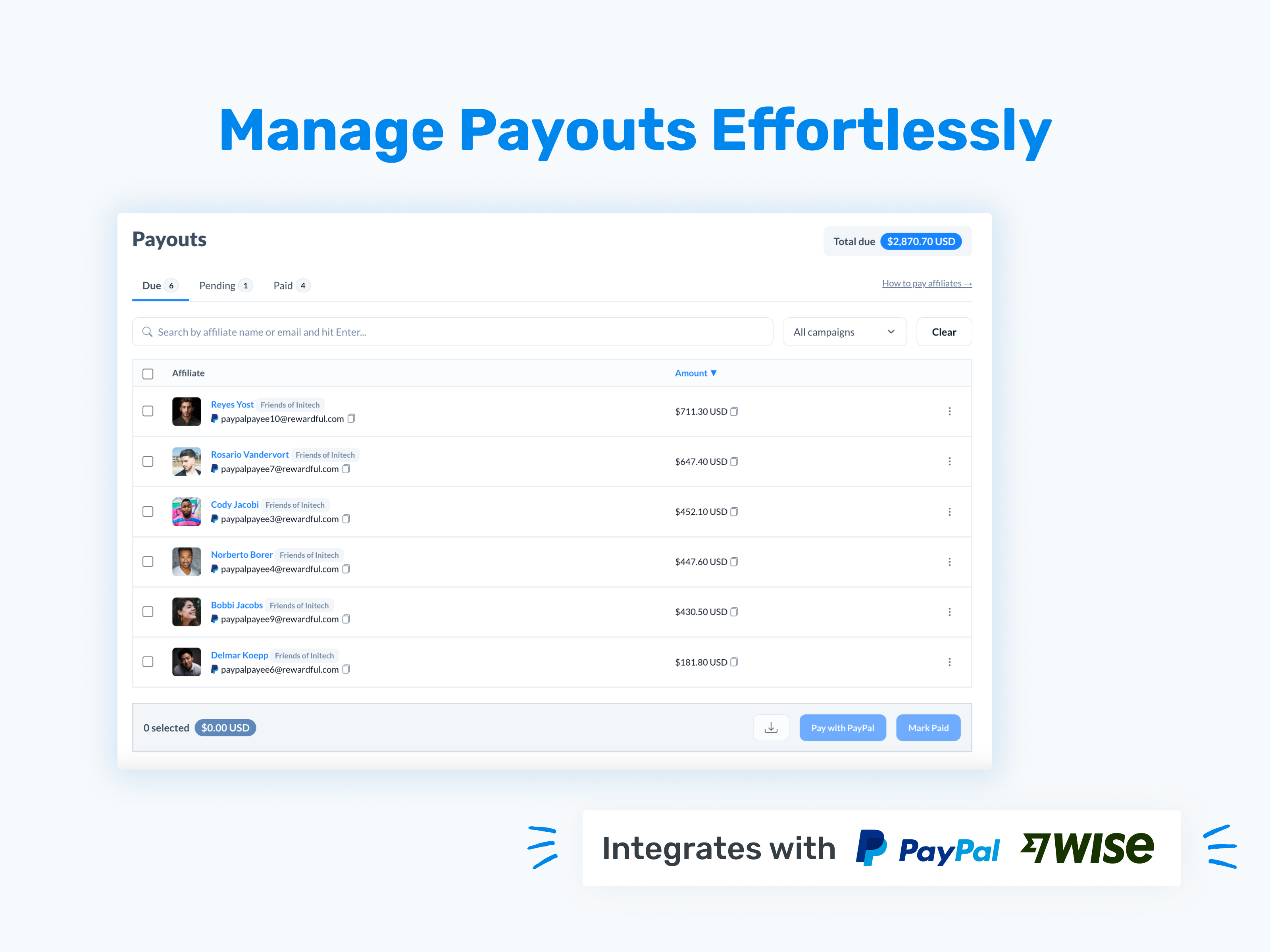 Thanks Chris! Our Managed Payouts service is now available. The process is greatly simplified for our users: now instead of paying affiliates manually yourself, you just pay a single invoice to Rewardful. Then, Rewardful will pay affiliates based on their preferred payment method. Feel free to get in touch with our Support team if you're interested. Have a great day!