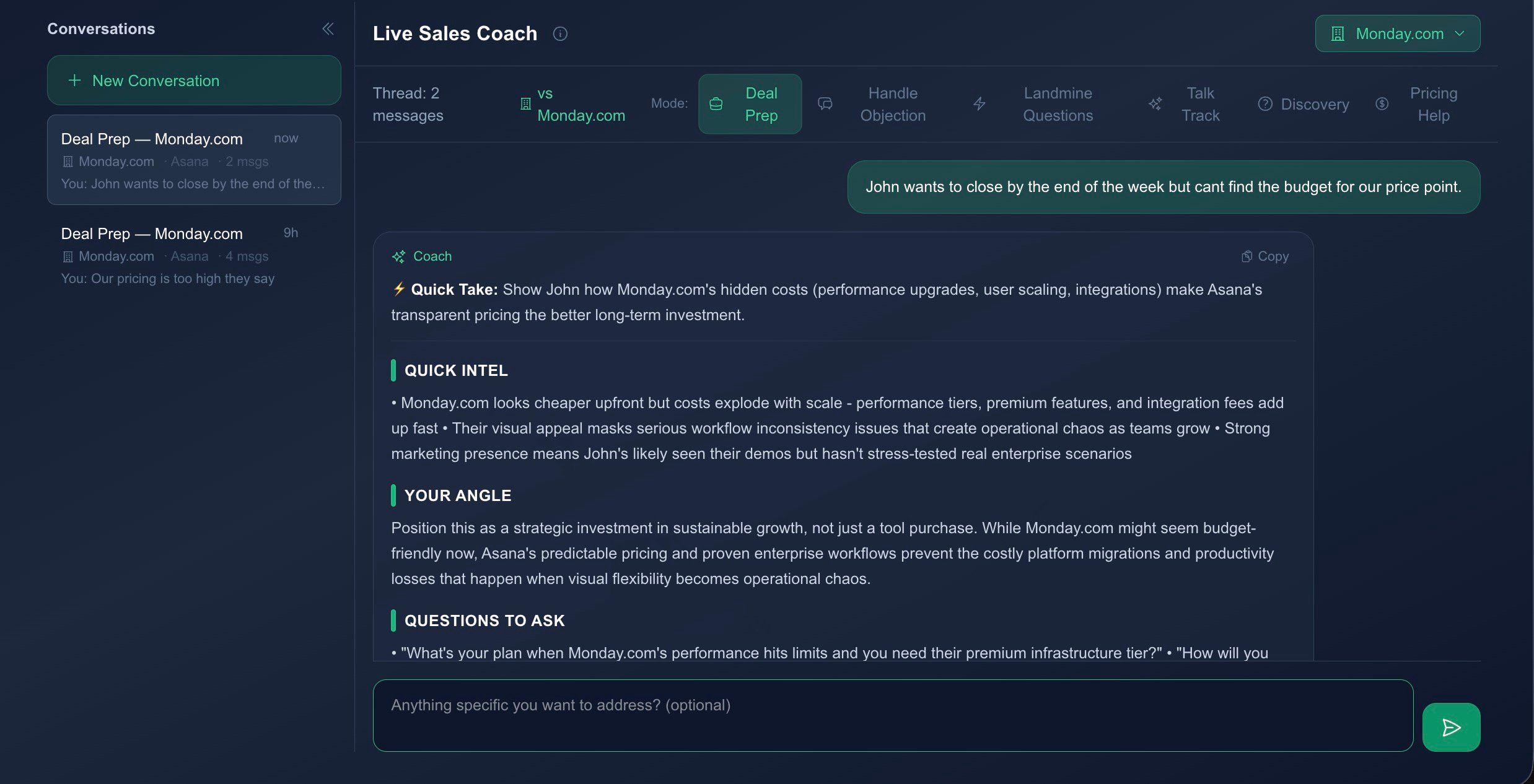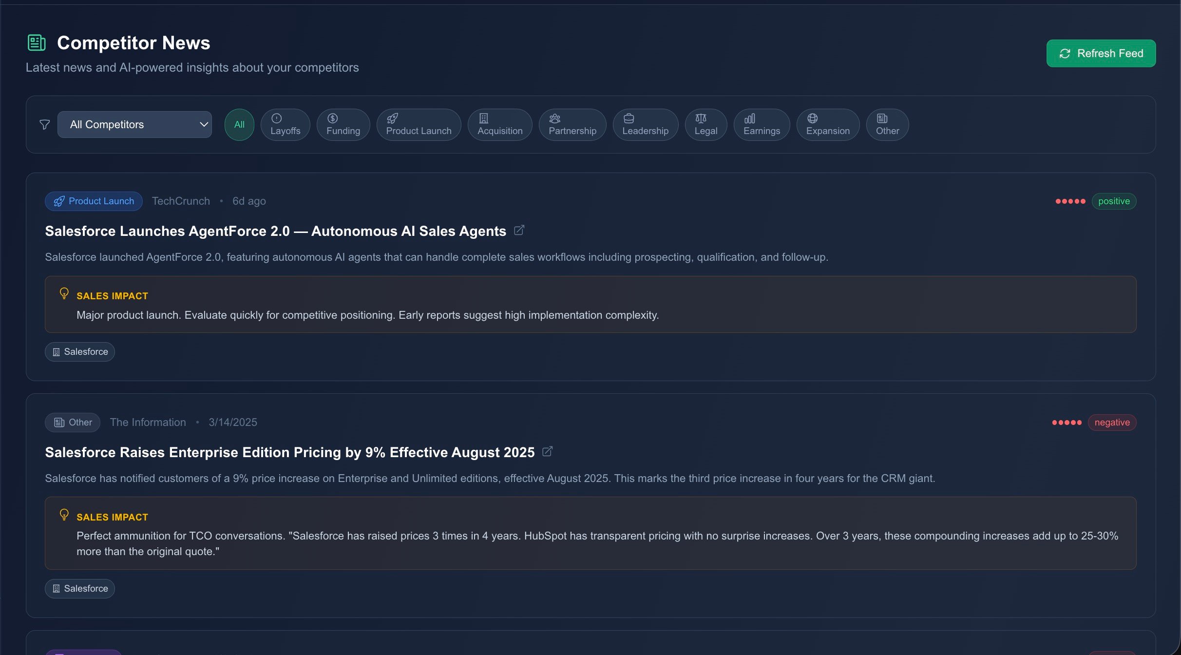 The battle cards are exactly what I needed. In my world, I'm going up against 3-4 competitors in every hospital system and the reps who win are the ones who know the landscape cold. RivalRadar gives me talk tracks, objection handlers, and landmine questions specific to each competitor. I pulled up a battle card on my phone 10 minutes before a meeting with a surgeon and nailed every comparison question they threw at me. Review collected by and hosted on G2.com.