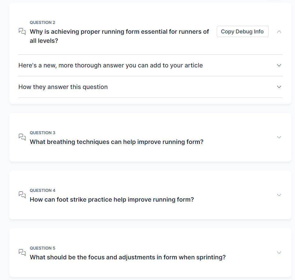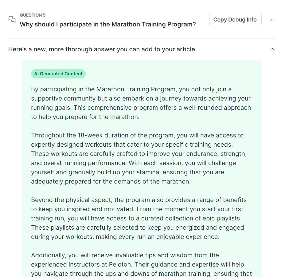 That analysis tells you what's missing. We use AI to generate answers to those missed questions in a way that blends smoothly with what is already on your page. That way you can catch up on the topic and offer more details than what you covered before.