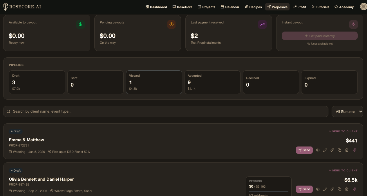 Connected AI Workflow: Describe an arrangement or event in chat. RoseCore automatically creates the recipe, the project, and the calendar event in one click. No copy-pasting. No re-entering. One conversation that runs your whole business.