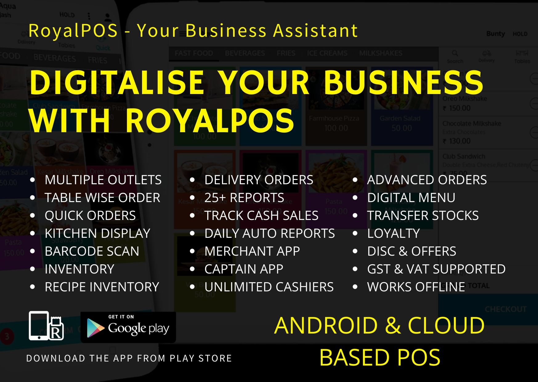 Royal POS - Point of Sale System for Take Away Fast Food Chains, Restaurants & Retail Stores - is developed with the cutting edge latest Android Technology and provides user friendly layouts for super easy Retail Point of Sale processing which is compatible with Android Tablet and Android Mobiles Too!