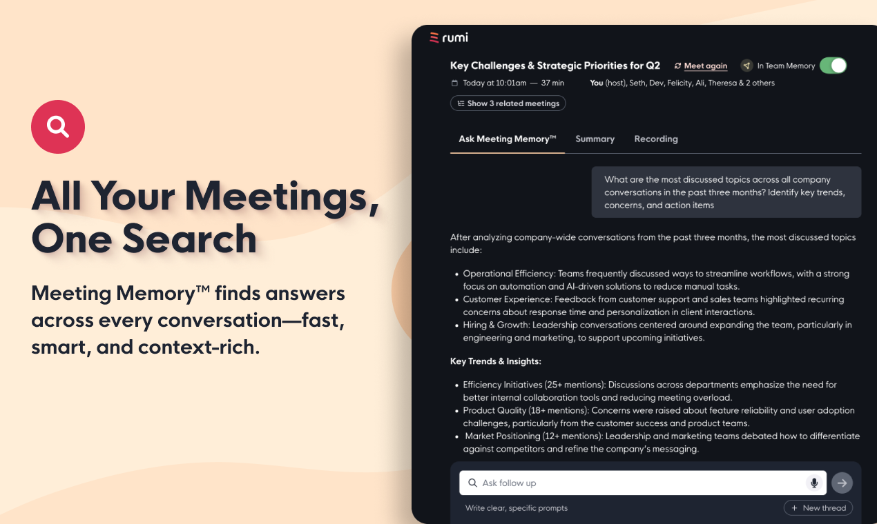 Meeting Memory™ unlocks every past conversation, turning talk into action with a simple ChatGPT-like dashboard. While other tools search one meeting at a time, Rumi searches through every meeting—yours and your team’s—for smarter, richer answers and content generation with real institutional context.