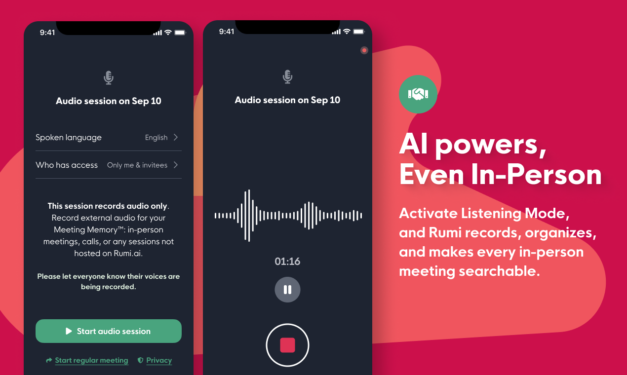 Meetings don’t just happen remotely—they happen in boardrooms, coffee shops, and client offices. With Listening Mode, Rumi comes with you. Activate it on your phone, and Rumi listens, records, and organizes your conversation into structured notes—just like a remote meeting. Every in-person meeting is then fully searchable in Meeting Memory™.
