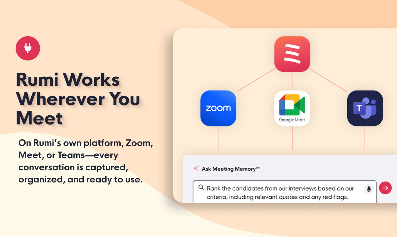 Rumi is built to be your go-to meeting platform, but we know you’re not always in one place. That’s why Rumi comes to you—on Zoom, Google Meet, and Teams—Host on Rumi’s own browser-based platform or let it join your external calls seamlessly. Either way, every conversation is recorded, organized, and ready for action.