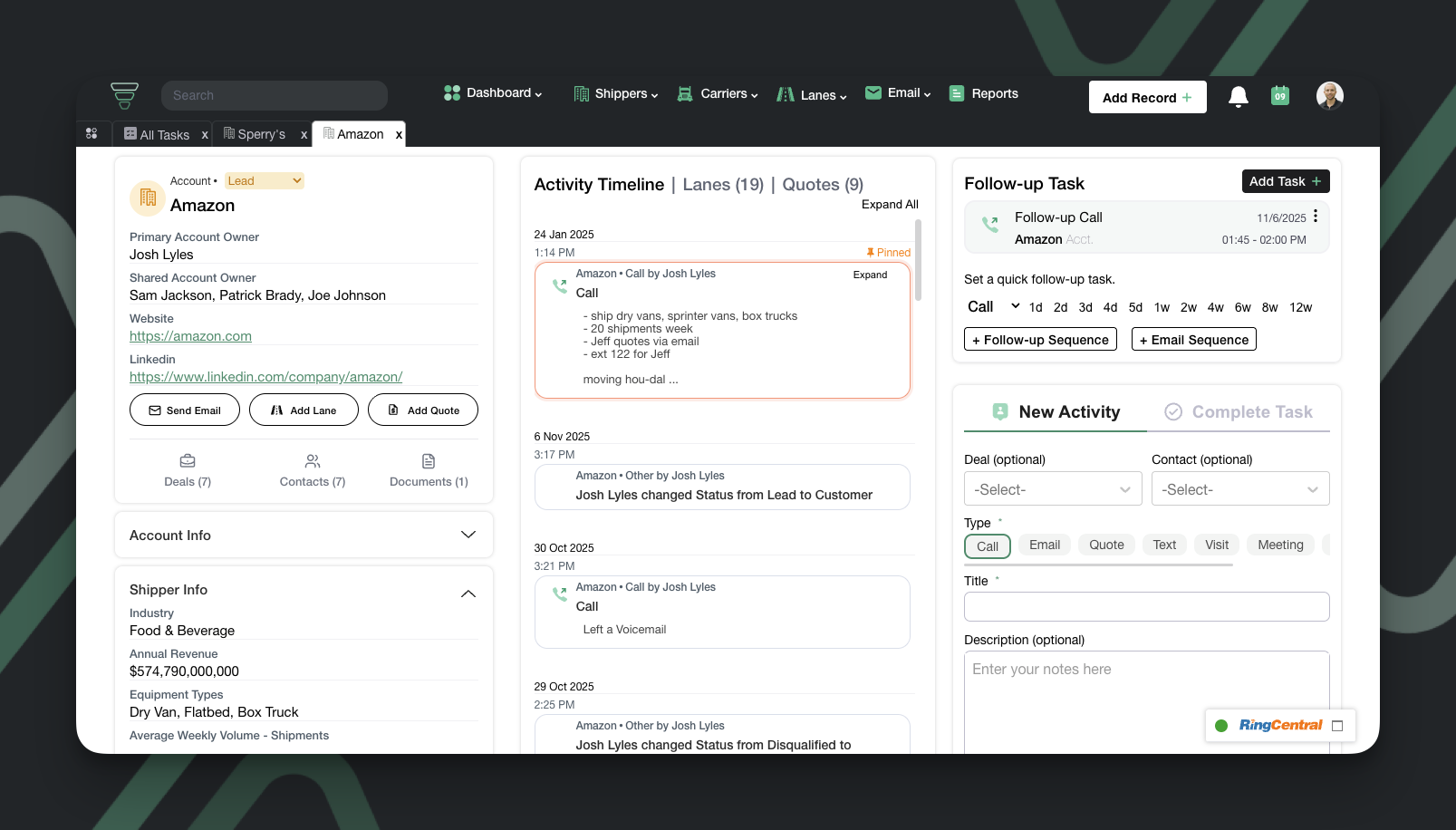 New shipper development: track outreach, log calls and emails, and capture lane/quote requests so opportunities are not lost.