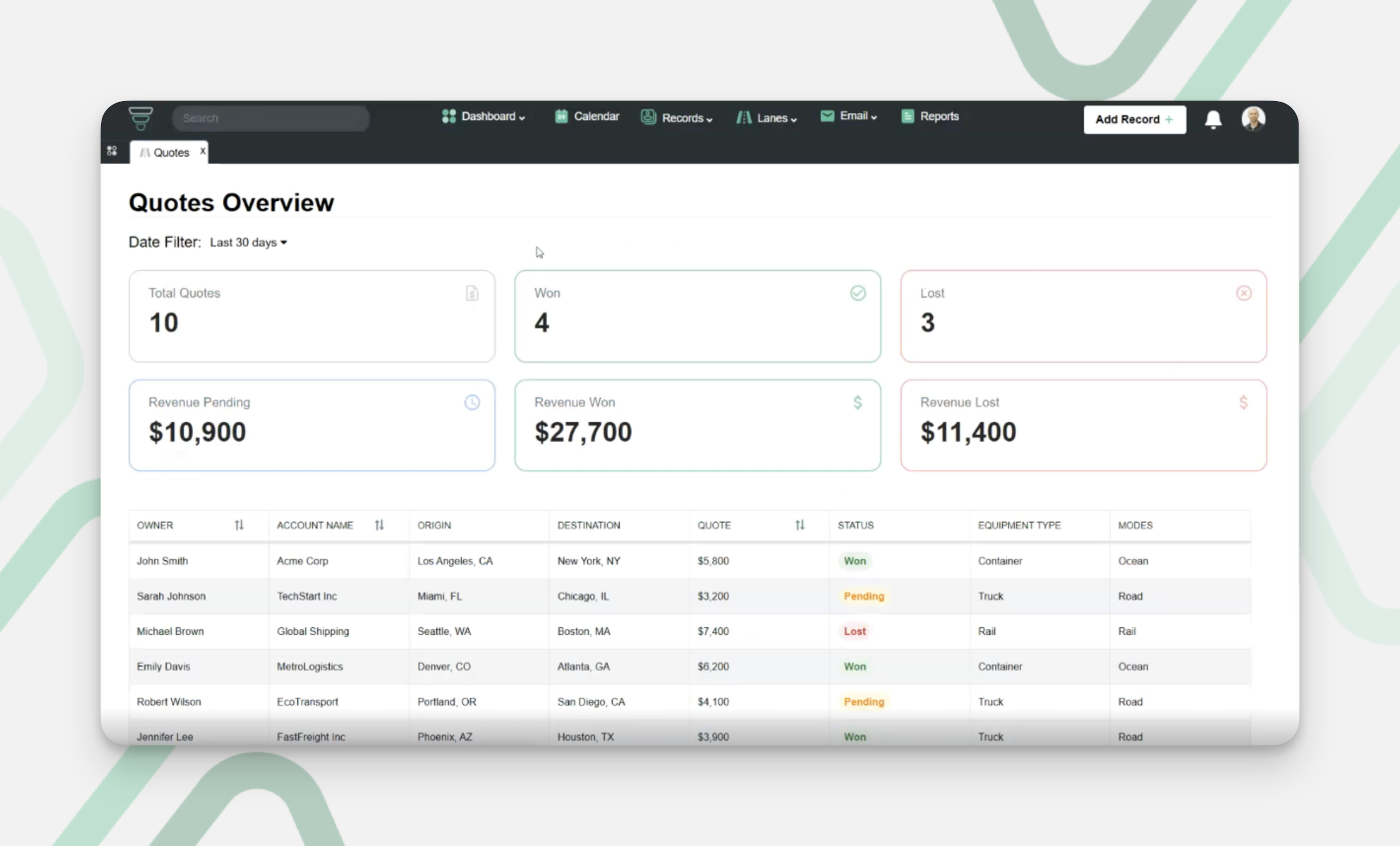 Salesdash CRM is a customer relationship management platform built specifically for freight brokers, freight agents, and logistics sales teams. The system provides tools to manage shipper and carrier relationships, track quoting activity, and organize follow-ups in a way that reflects how freight sales actually happen.
