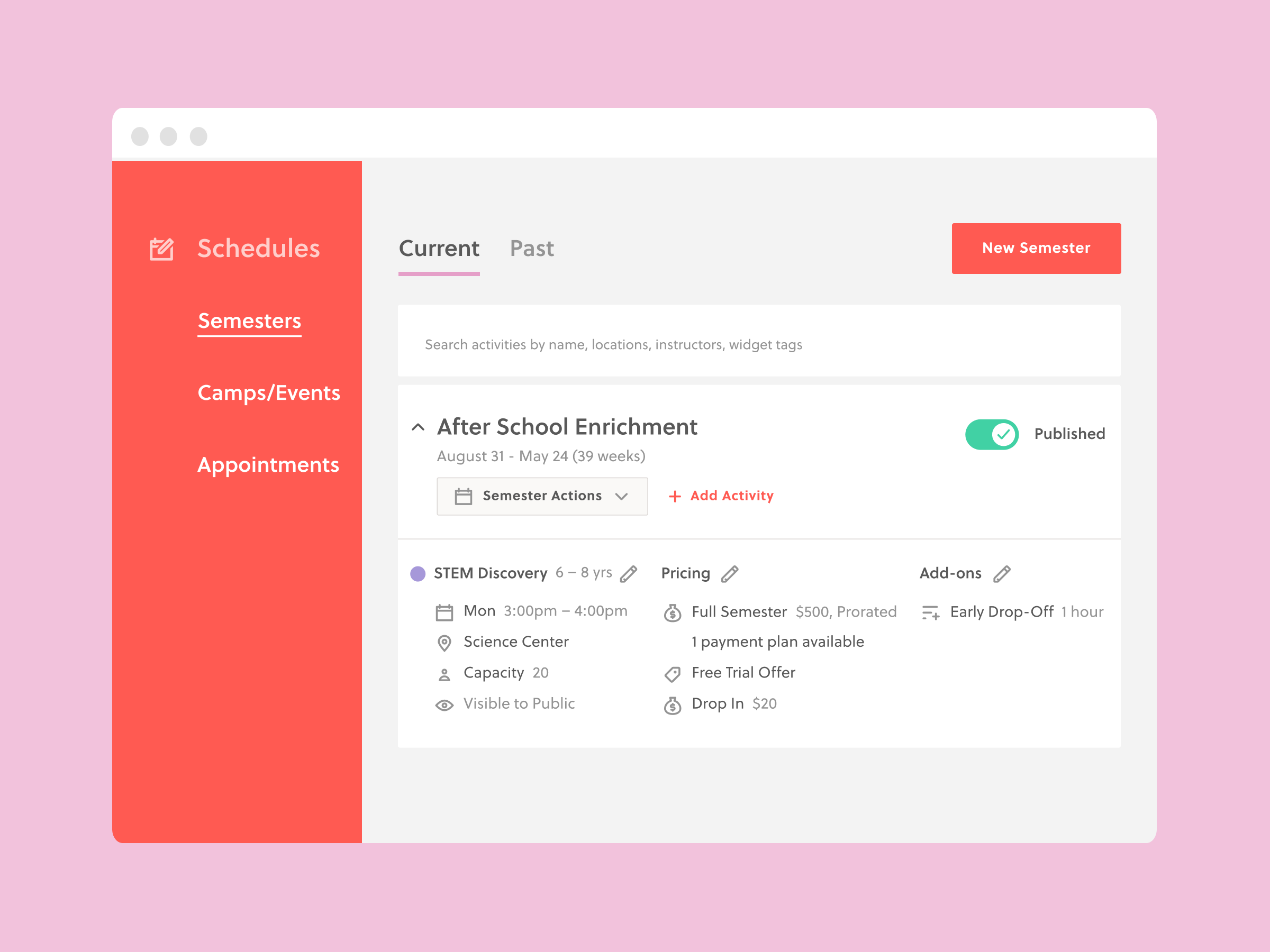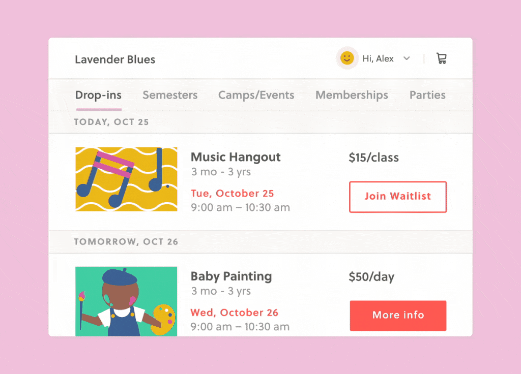 Put your programs in the spotlight and save time with our easy-to-use scheduling tools. Create camps, drop-ins, appointments, parties, and more.