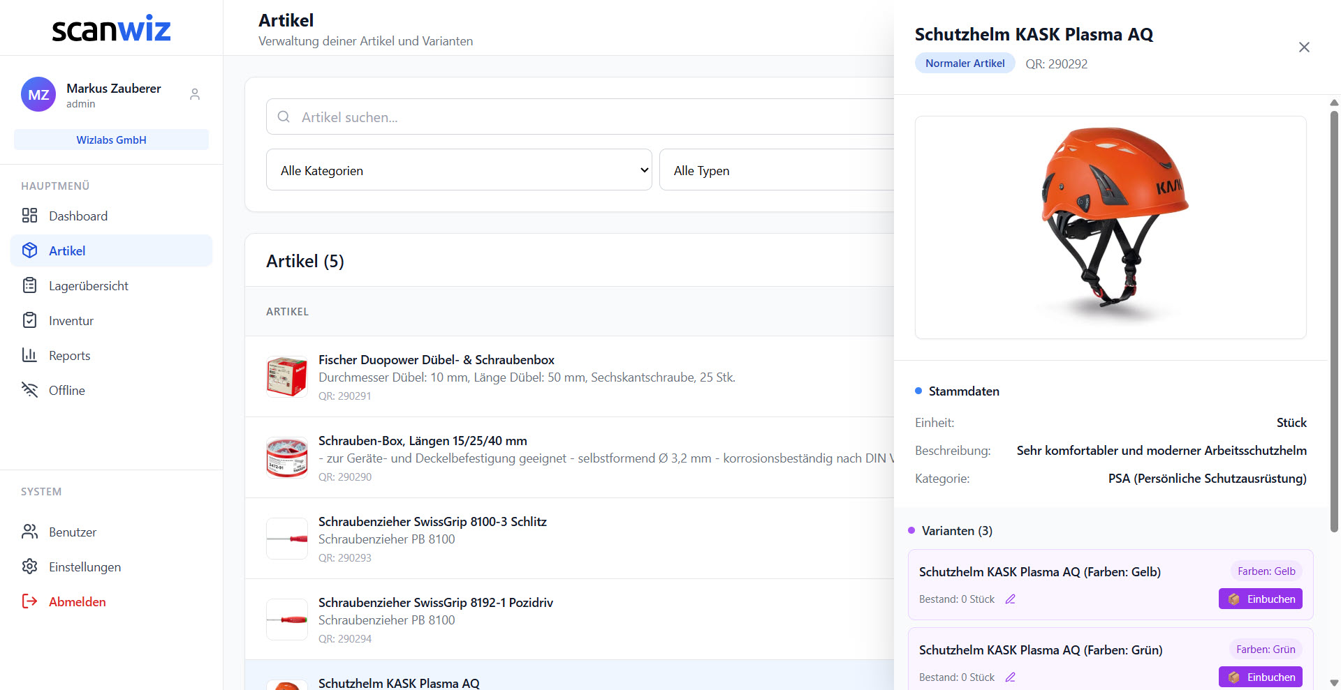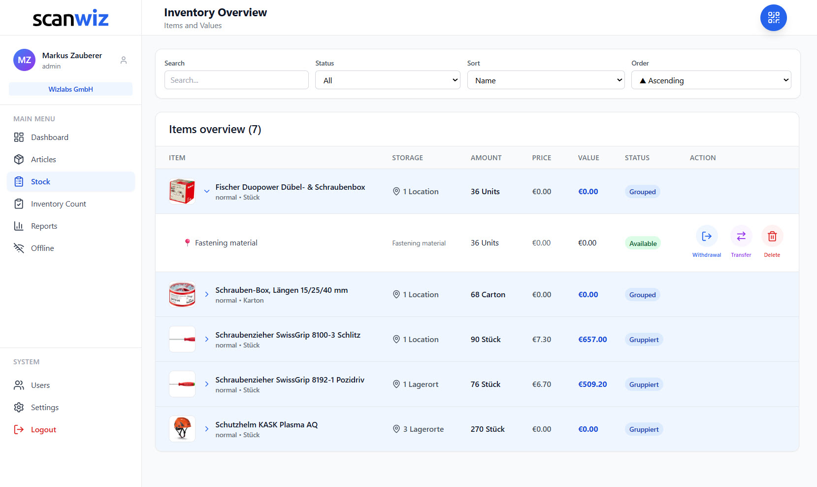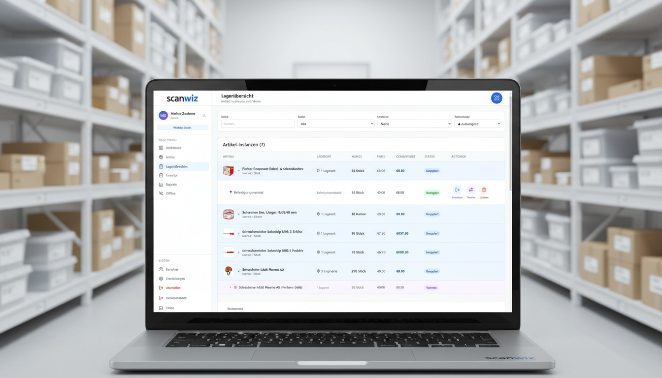 One of Scanwiz’s core strengths lies in its barcode scanner integration, which allows goods receipts, transfers, and item withdrawals to be recorded quickly and accurately. With support for common barcode formats and the ability to scan directly via smartphone or compatible devices, teams can drastically reduce manual entry errors and accelerate daily processes.