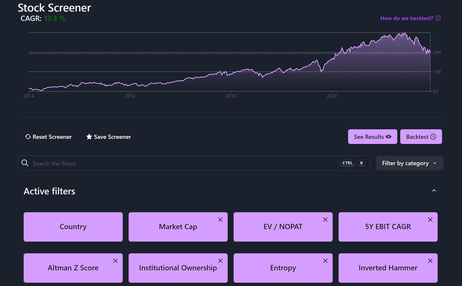 I like how easy it is to backtest strategies, and then find relevant stocks. I also like that you can implement criteria that doesn't exist elsewhere, like technical indicators. Review collected by and hosted on G2.com.