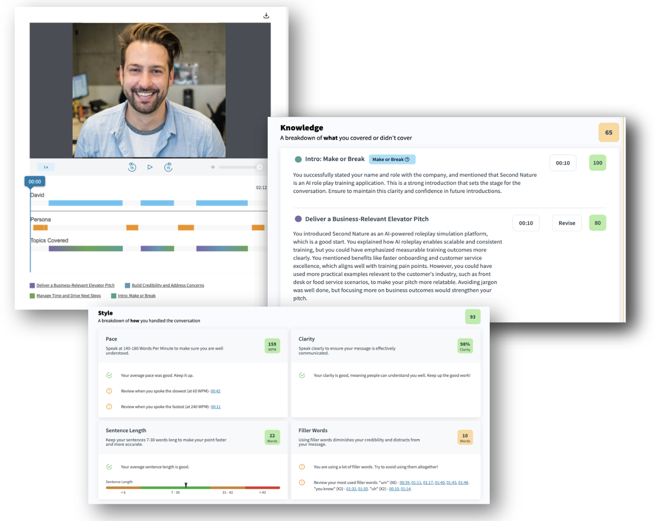 Second Nature uses generative AI and machine learning to power immersive role-play simulations for workplace training. AI-driven personas engage in natural-language conversations using dialogue models (like GPT) to ask questions, pose objections, change “mood” etc.