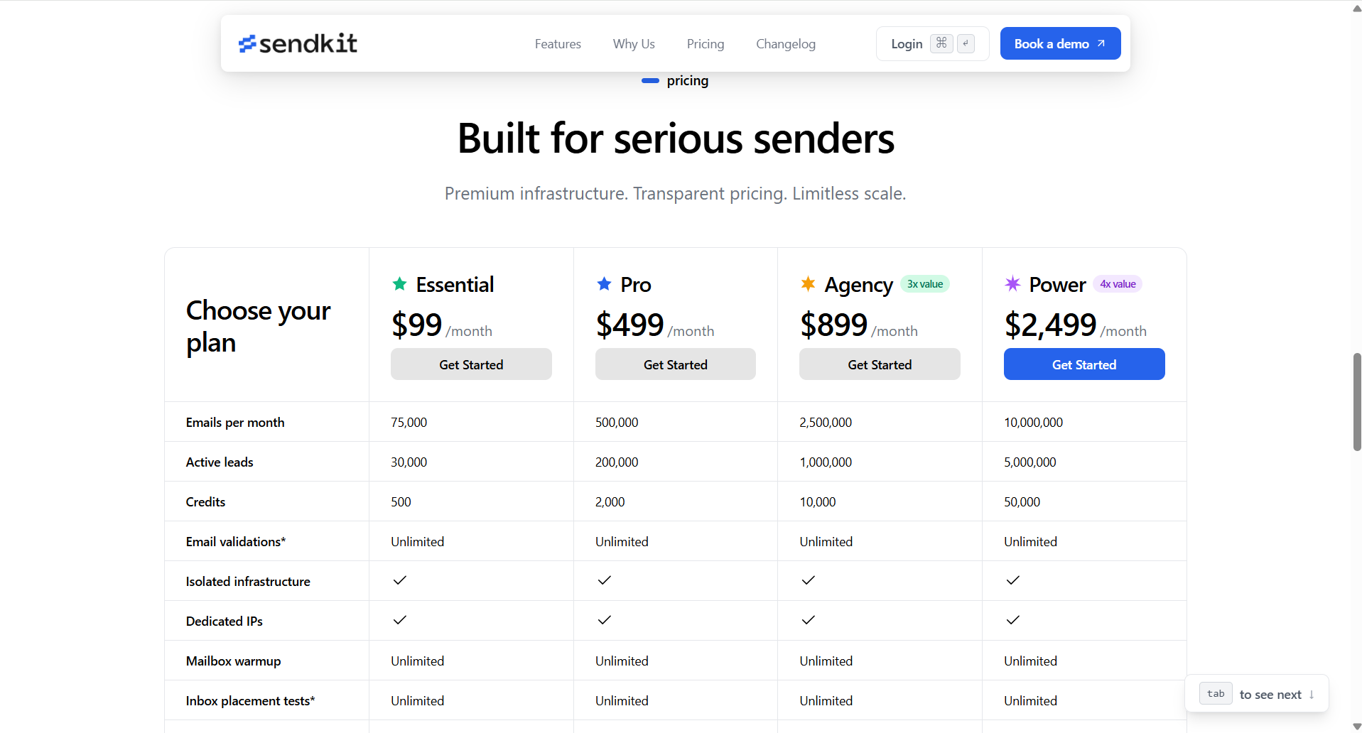 Pricing starts at $99 month (Essential) for 75,000 emails/month, $499/month (Pro) for 500K emails/month,$899/month (Agency) for 2.5M emails/month and $2499 (Power) for 10,000,000 emails/month all with unlimited workspaces, team members, lead uploads, and email validation included.