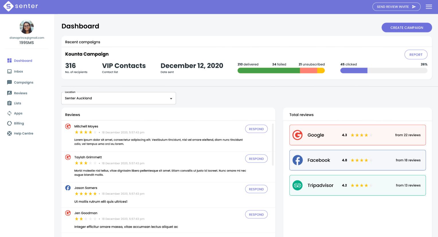 Screen showing reviews and camaign stats