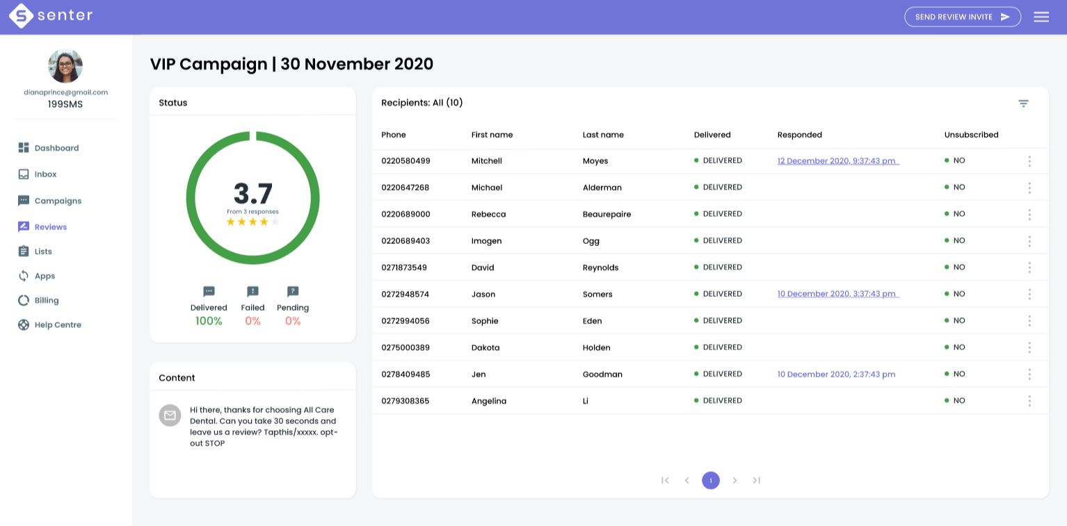 Screen showing your sms and review reporting