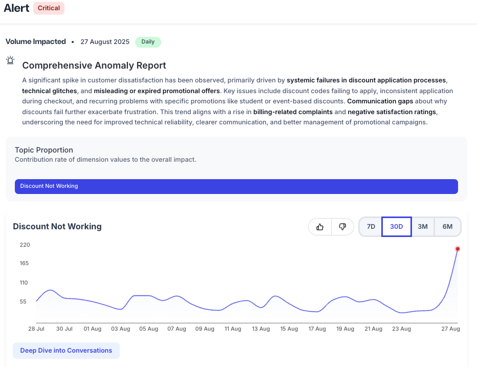 I love the fact that the product is so versatile! You get the benefit of using the product's AI to review the tickets however you also have the option to dive deeper into specific drivers/topics by creating your own set of parameters. I enjoy how easy it is to scrub through tickets so that you can accurately calculate a trend or to better investigate ongoing issues. Review collected by and hosted on G2.com.