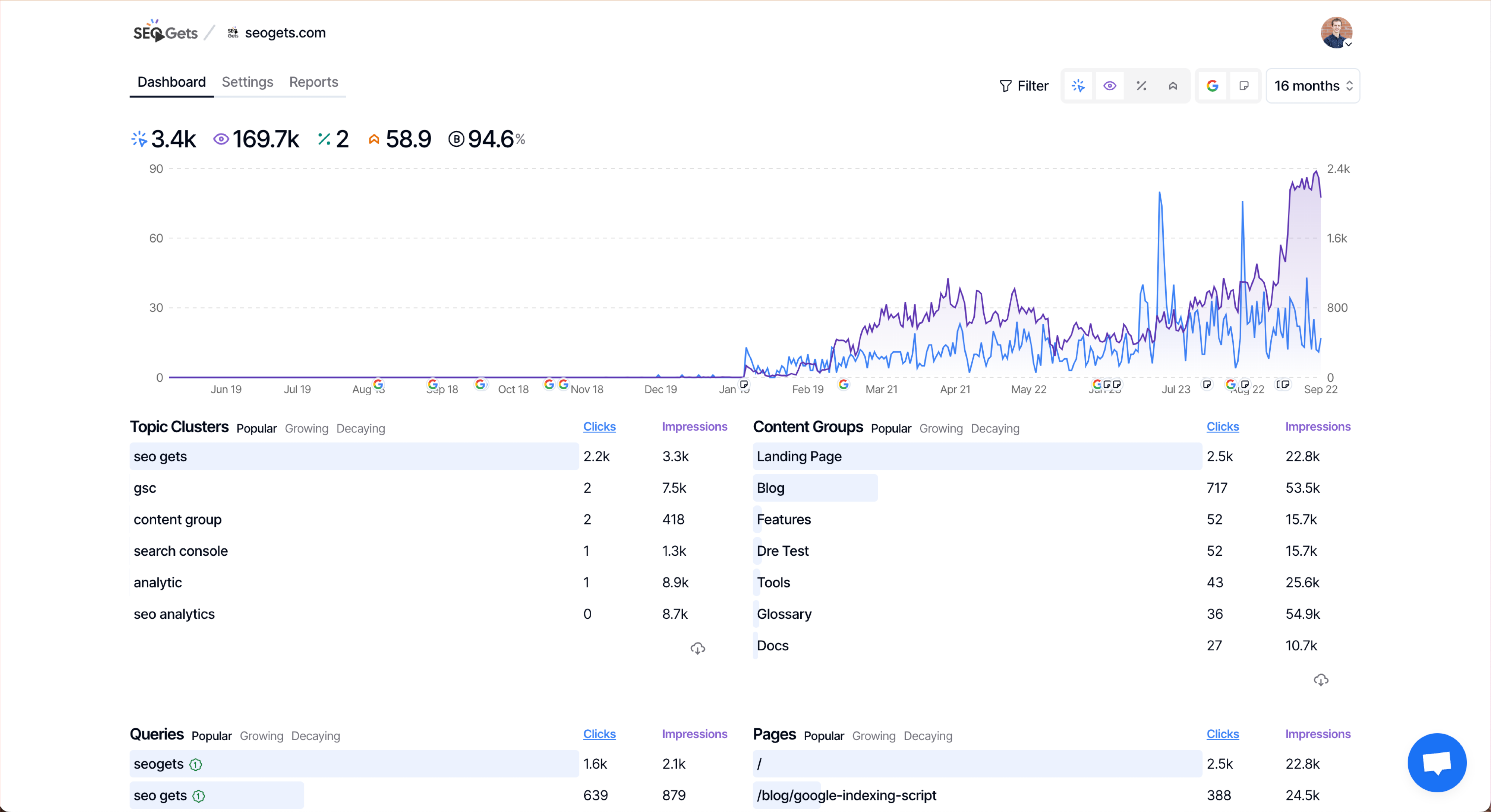 - Easy access to performance data aggregated by topic, content type, brand/non-brand, and more!