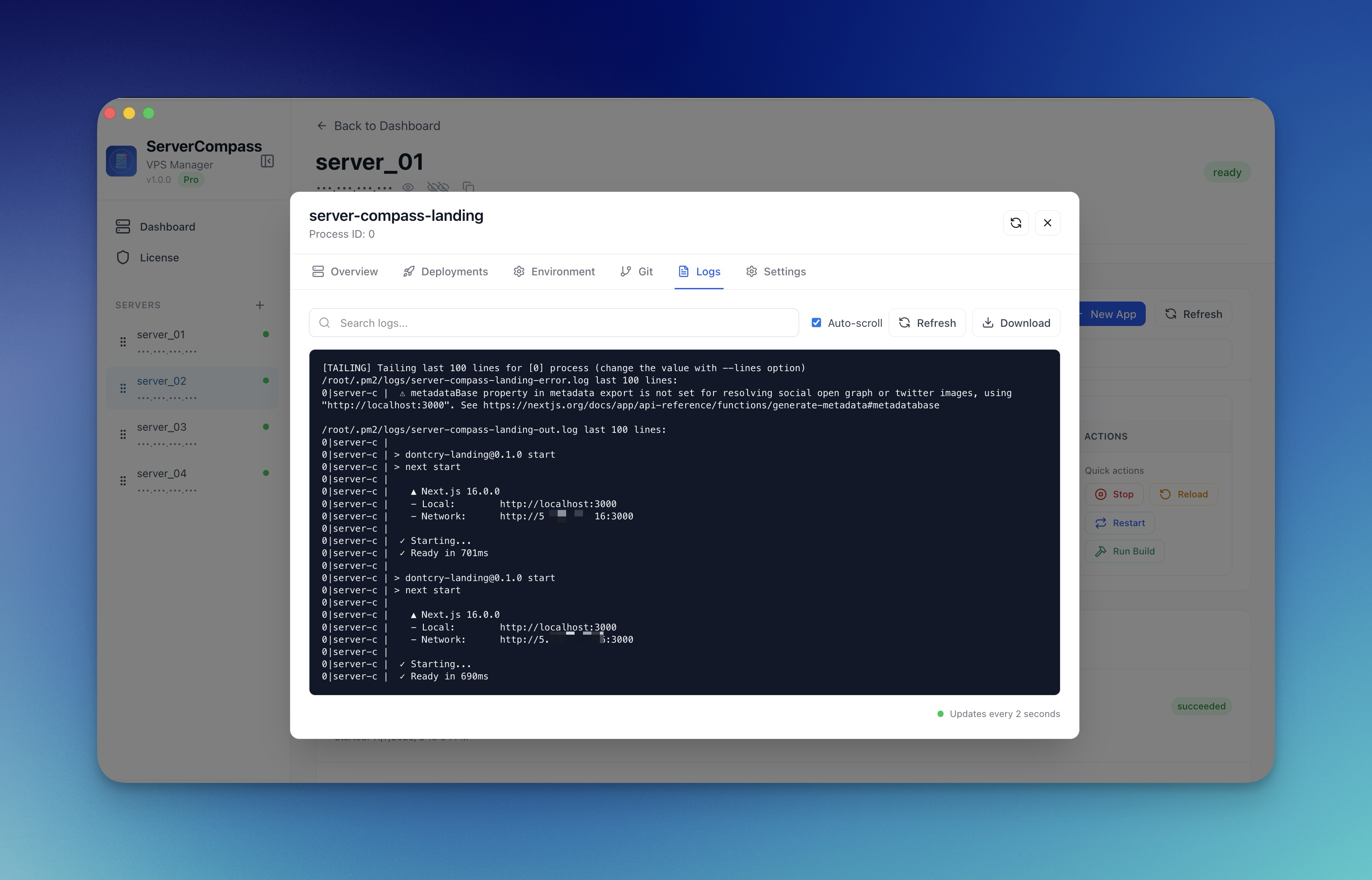 ServerCompass brings the simplicity of modern PaaS platforms like Heroku, Vercel, and Railway to your own VPS infrastructure. No more juggling terminal windows, remembering SSH commands, or managing credentials in plain text files. Get a polished, intuitive desktop experience for managing all your servers—without cloud lock-in or recurring platform fees.