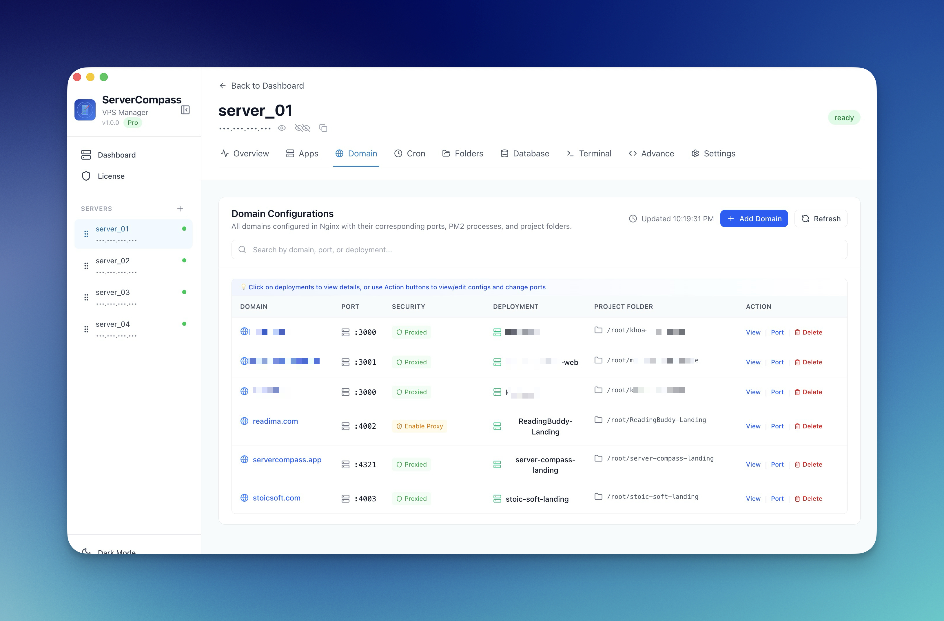 Manage your VPS with the same ease as cloud platforms. Deploy applications, configure domains, and monitor performance through a clean, modern interface designed for developers who value both power and simplicity.