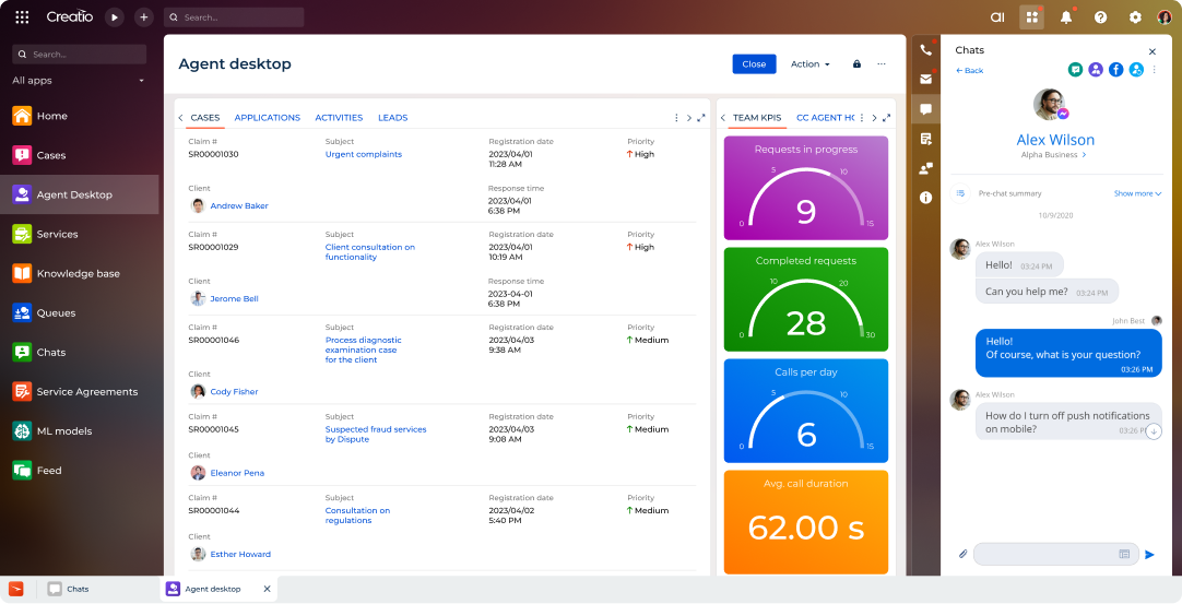 Service Creatio is an AI-powered, no-code platform for full-cycle customer service management. It consolidates service workflows (internal and external) into a unified center, managing cases, agents, knowledge, and communication—on all channels. It’s built on the Studio Creatio platform with a composable architecture.