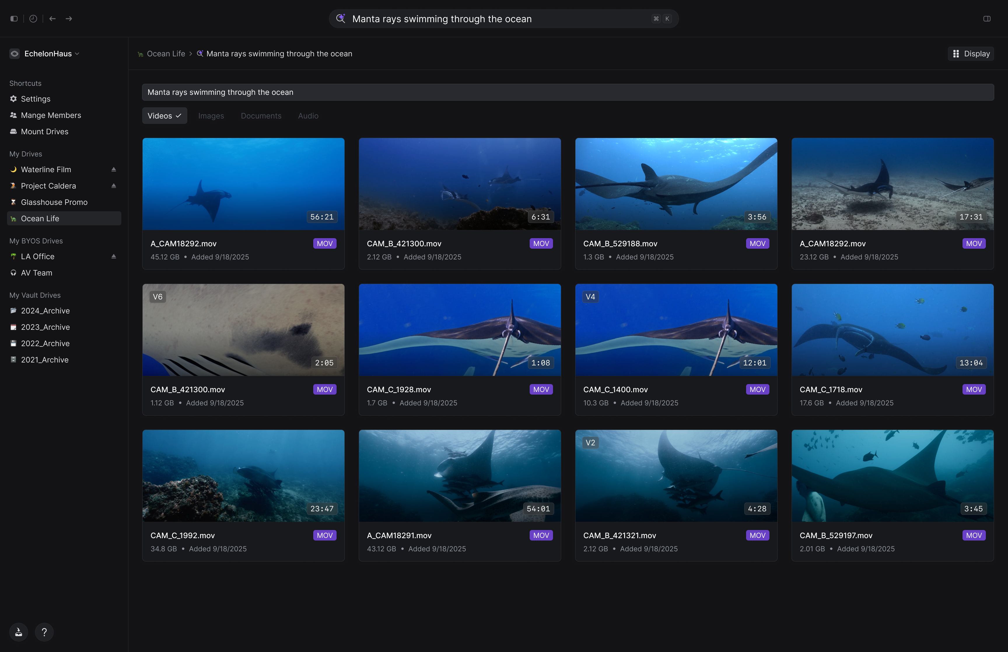 The platform supports various professional media formats including RAW images, BRAW video files, and multiple audio codecs. Users can search their entire media library using natural language queries to locate specific assets without manual tagging or organization.