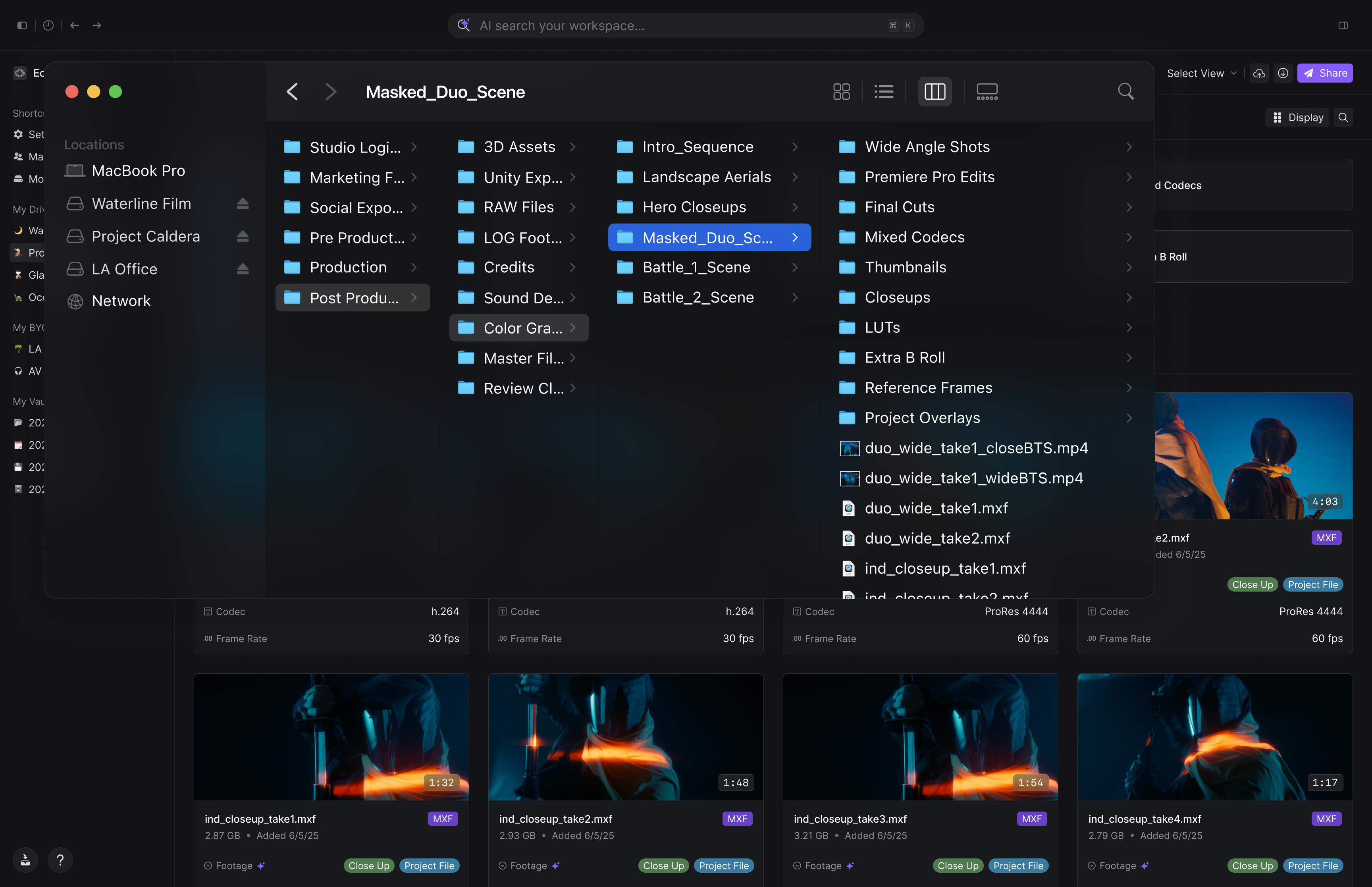 * Native support for professional codecs and formats with preview capabilities, thumbnail scrubbing, and direct drag-and-drop integration into editing applications